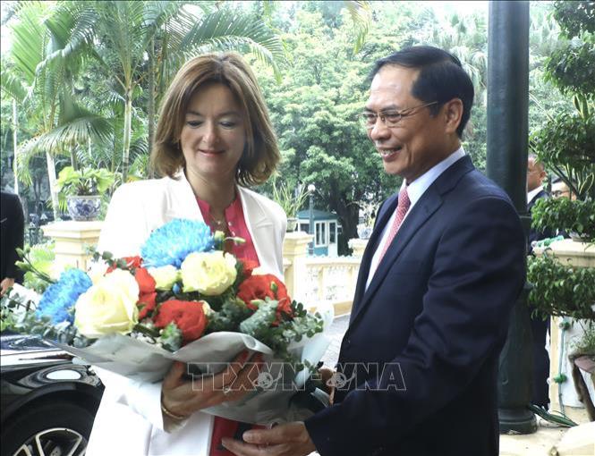 Bộ trưởng Ngoại giao Bùi Thanh Sơn đón Phó Thủ tướng, Bộ trưởng Ngoại giao và Các vấn đề châu Âu Cộng hoà Slovenia Tanja Fajon thăm chính thức Việt Nam (23/5/2023). Ảnh: Lâm Khánh/TTXVN