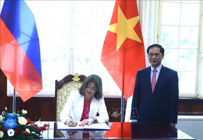 Bộ trưởng Ngoại giao Bùi Thanh Sơn chứng kiến Phó Thủ tướng, Bộ trưởng Ngoại giao và Các vấn đề châu Âu Cộng hoà Slovenia Tanja Fajon ghi lưu bút (23/5/2023). Ảnh: Lâm Khánh/TTXVN