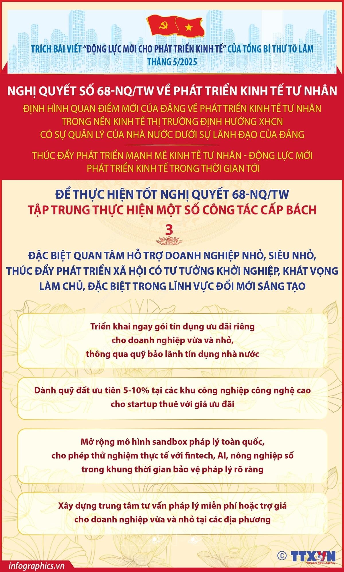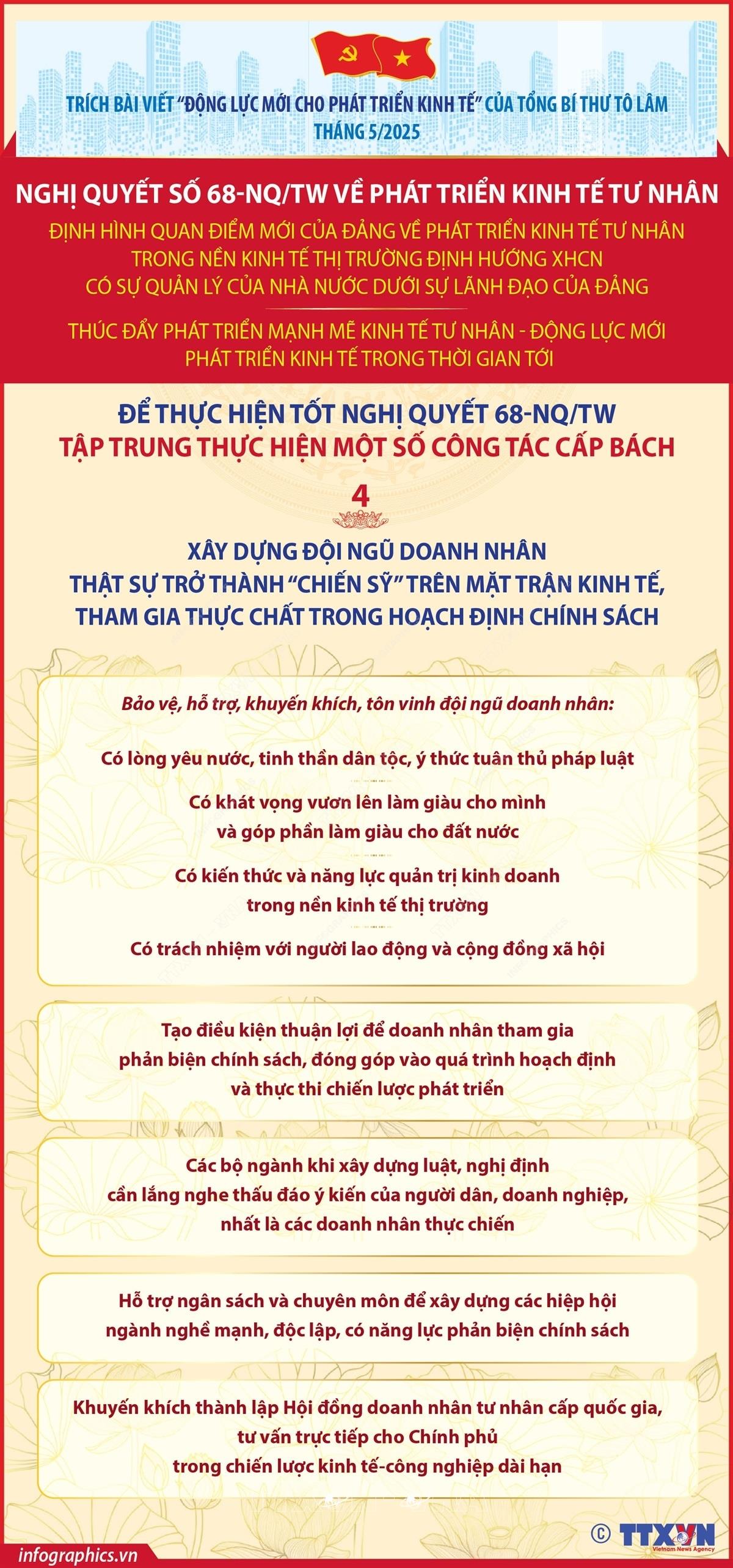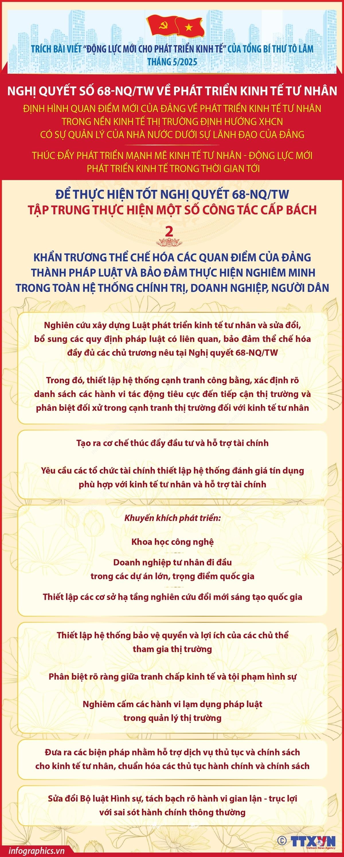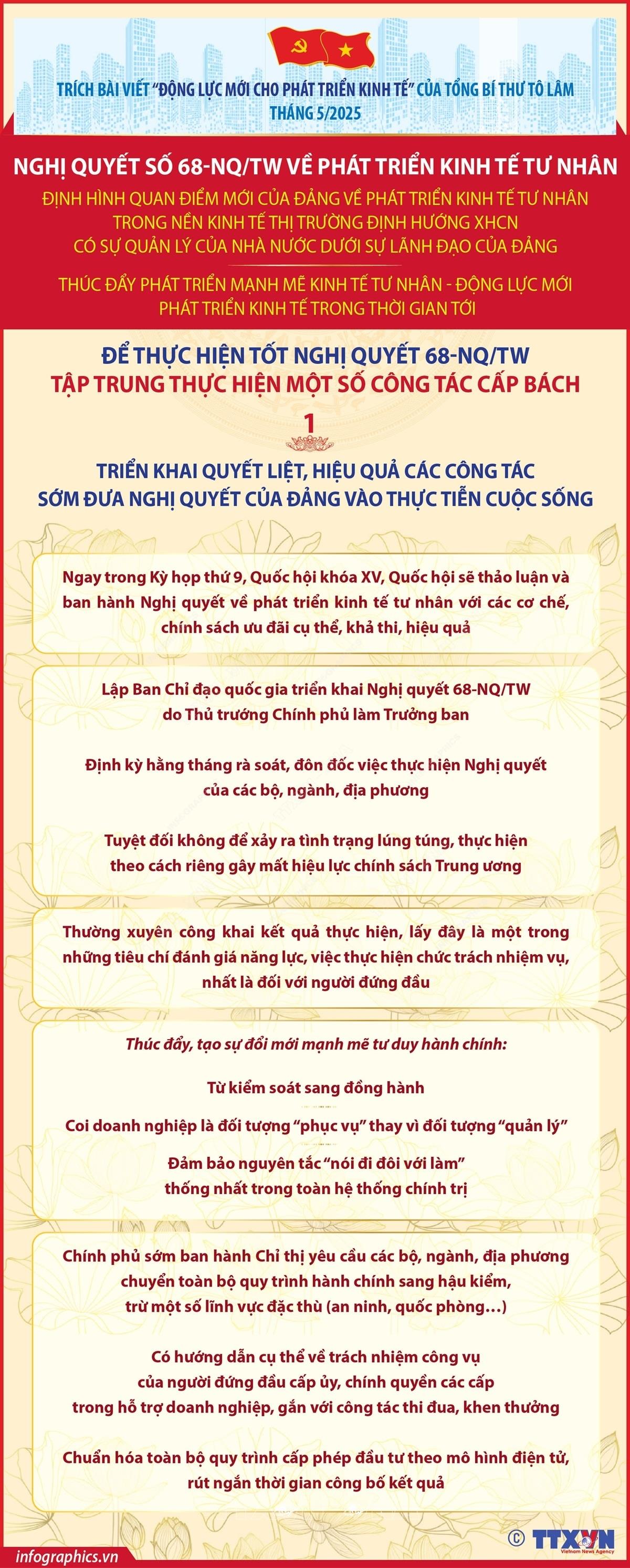 Theo Tổng Bí thư Tô Lâm, để thực hiện thắng lợi Nghị quyết số 68, cần tập trung thực hiện một số công tác cấp bách sau đây: Thứ nhất, triển khai quyết liệt, hiệu quả các công tác sớm đưa Nghị quyết của Đảng vào thực tiễn cuộc sống. Thứ hai, khẩn trương thể chế hoá các quan điểm của Đảng thành pháp luật và bảo đảm thực hiện nghiêm minh trong toàn hệ thống chính trị, doanh nghiệp, người dân. Thứ ba, đặc biệt quan tâm hỗ trợ doanh nghiệp nhỏ, siêu nhỏ, thúc đẩy phát triển xã hội có tư tưởng khởi nghiệp, khát vọng làm chủ, đặc biệt trong lĩnh vực đổi mới sáng tạo. Thứ tư, xây dựng đội ngũ doanh nhân thật sự trở thành “chiến sỹ” trên mặt trận kinh tế, tham gia thực chất trong hoạch định chính sách.