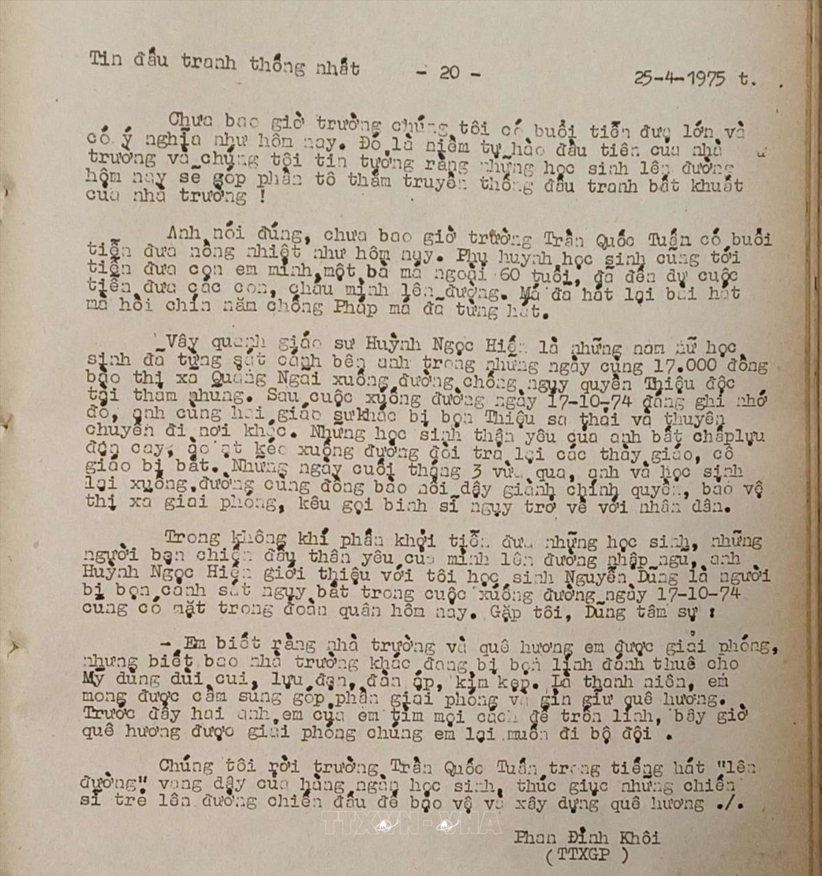 Buổi tiễn đưa nồng nhiệt Tin đấu tranh thống nhất của Việt Nam Thông tấn xã, ngày 25/4/1975 Từ khóa:Giải phóng miền Namthống nhất đất nướcThông tấn xã Giải phóngQuảng Ngãi