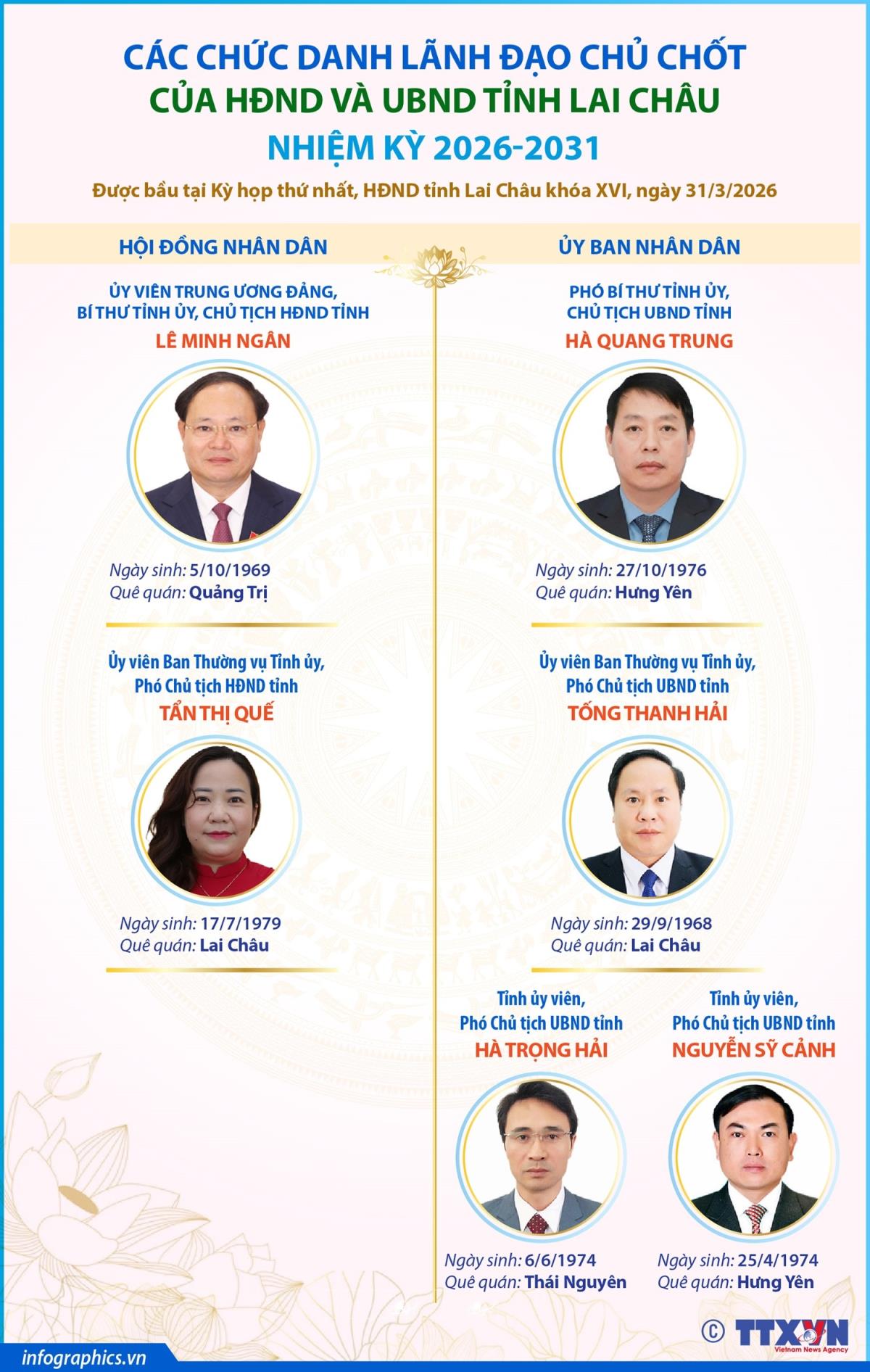 Hà Nội (TTXVN 1/4/2026) Ngày 31/3/2026, tại Kỳ họp thứ nhất, HĐND tỉnh Lai Châu khóa XVI, nhiệm kỳ 2026-2031 đã bầu đồng chí Lê Minh Ngân, Ủy viên Trung ương Đảng, Bí thư Tỉnh ủy giữ chức Chủ tịch HĐND tỉnh khóa XVI, nhiệm kỳ 2026-2031. Đồng chí Tẩn Thị Quế tái cử giữ chức Phó Chủ tịch HĐND tỉnh khóa XVI, nhiệm kỳ 2026-2031. Tại kỳ họp, HĐND tỉnh Lai Châu đã bầu đồng chí Hà Quang Trung, Phó Bí thư Tỉnh ủy, Chủ tịch UBND tỉnh khóa XV, nhiệm kỳ 2021-2026 tiếp tục giữ chức Chủ tịch UBND tỉnh khóa XVI, nhiệm kỳ 2026-2031. Phó Chủ tịch UBND tỉnh khóa XVI, nhiệm kỳ 2026-2031 gồm các đồng chí: Tống Thanh Hải, Hà Trọng Hải và Nguyễn Sỹ Cảnh.