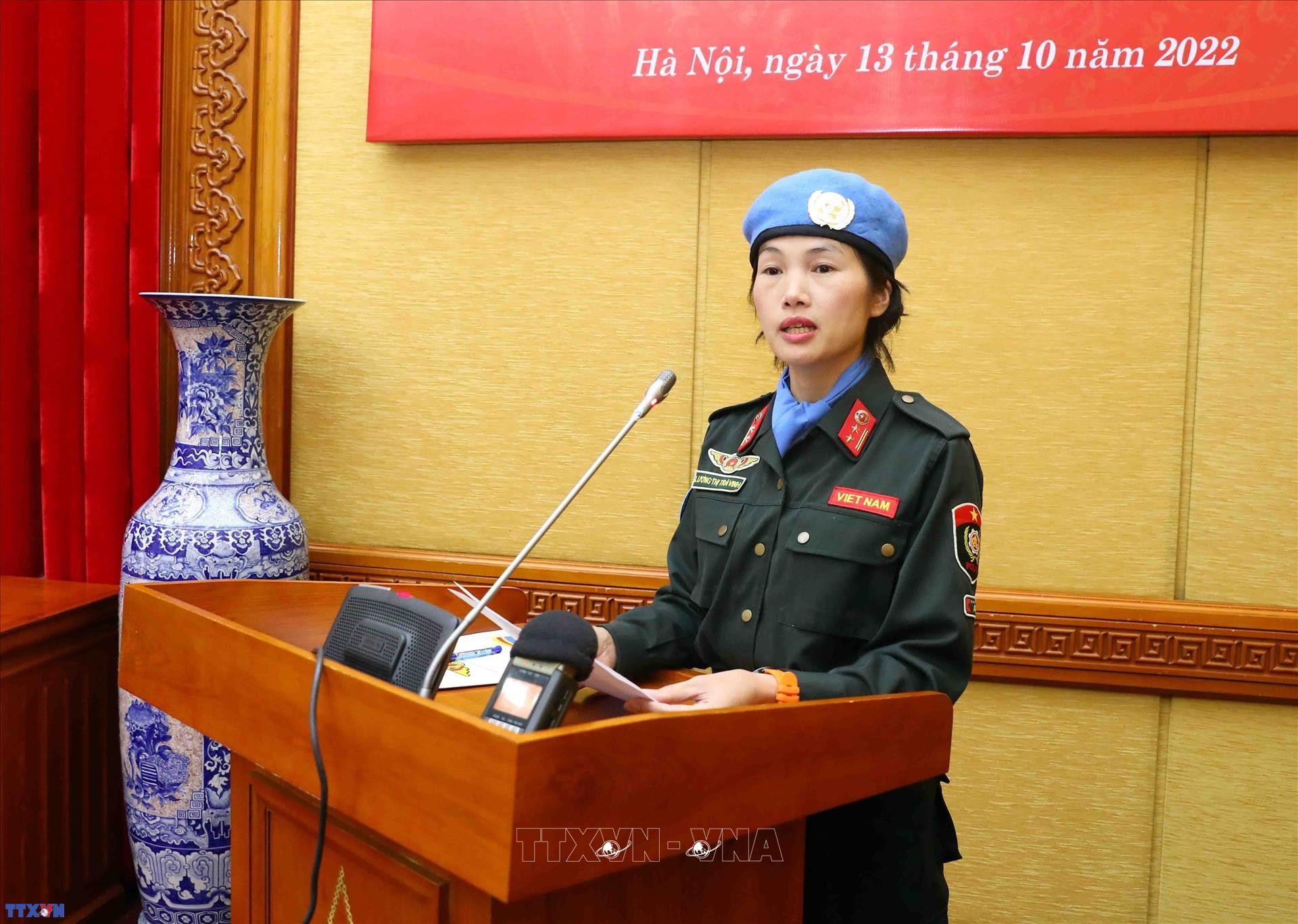 Trung tá Lương Thị Trà Vinh, đại diện 3 sĩ quan Công an nhân dân lên đường thực hiện nhiệm vụ gìn giữ hòa bình Liên hợp quốc tại Nam Sudan phát biểu. Ảnh: Phạm Kiên - TTXVN