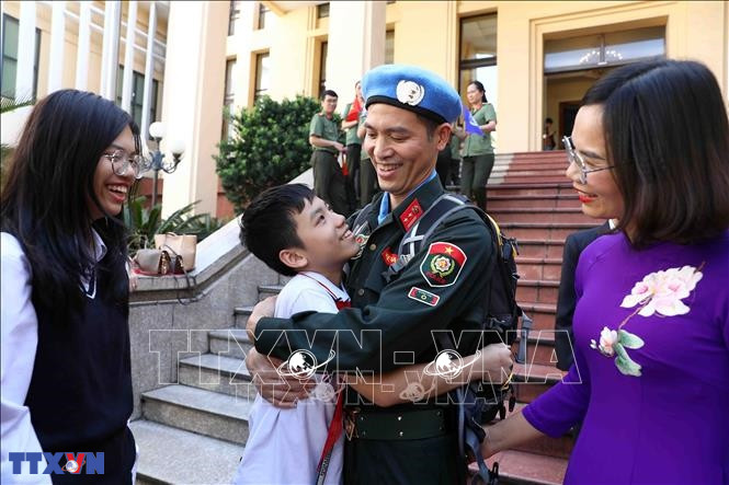 Người thân chia tay các sĩ quan Công an nhân dân lên đường thực hiện nhiệm vụ gìn giữ hòa bình Liên hợp quốc tại Nam Sudan. Ảnh: Phạm Kiên - TTXVN