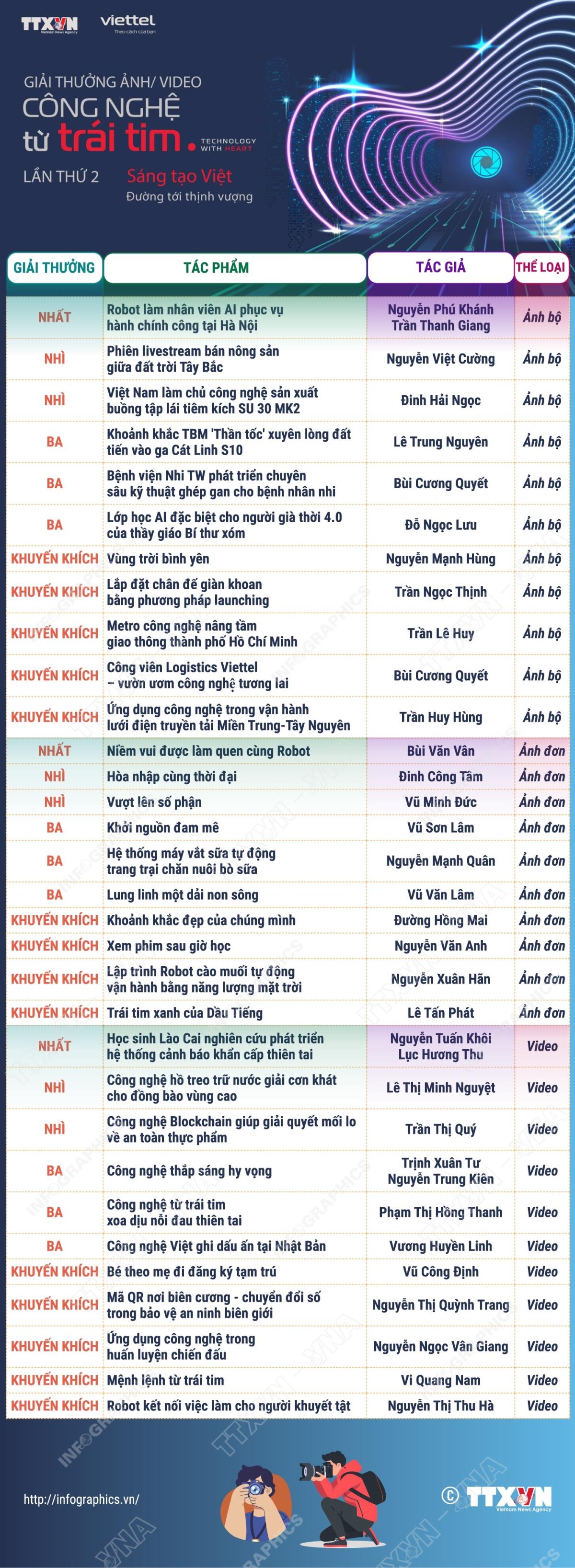 Hà Nội (TTXVN 23/10/2025) Sau 5 tháng phát động, Ban tổ chức Giải thưởng “Công nghệ từ trái tim - Technology with heart” lần thứ 2 đã nhận được 1.131 tác phẩm ảnh đơn, 229 tác phẩm ảnh bộ và 122 tác phẩm video. Qua 3 vòng chấm công tâm, khách quan, nghiêm túc, trách nhiệm, Hội đồng Giải thưởng đã quyết định trao giải cho 32 tác phẩm xuất sắc nhất, bao gồm: 11 giải ở Thể loại Ảnh bộ (1 giải Nhất, 2 giải Nhì, 3 giải Ba và 5 giải Khuyến khích); 10 giải ở thể loại Ảnh đơn (1 giải Nhất, 2 giải Nhì, 3 giải Ba và 4 giải Khuyến khích); 11 giải ở thể loại Video (1 giải Nhất, 2 giải Nhì, 3 giải Ba và 5 giải Khuyến khích).