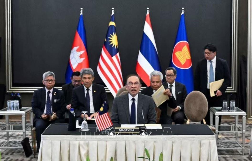 Thủ tướng Malaysia Anwar Ibrahim (phía trước) chủ trì cuộc đàm phán giữa Thủ tướng Campuchia Hun Manet và Quyền Thủ tướng Thái Lan Phumtham Wechayachai về thỏa thuận ngừng bắn ở khu vực biên giới hai nước, tại Putrajaya, ngày 28/7/2025. Ảnh: REUTERS/TTXVN
