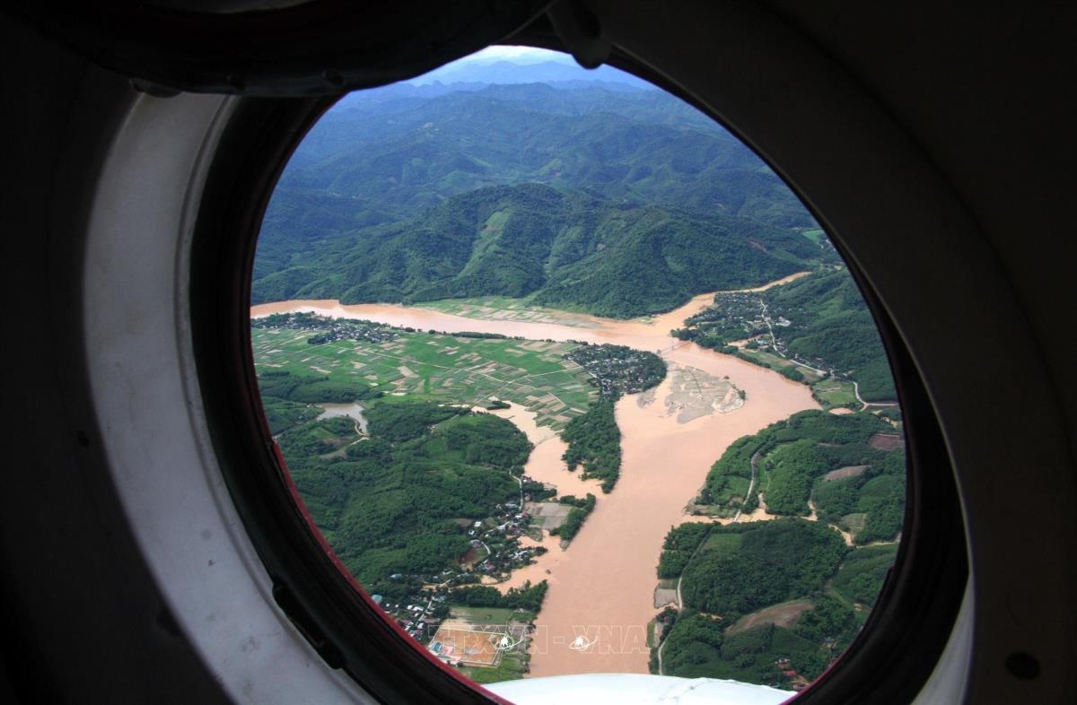 Một đoạn sông Lam đỏ ngầu nhìn từ trực thăng. (7/2025) Ảnh: Văn Tý-TTXVN