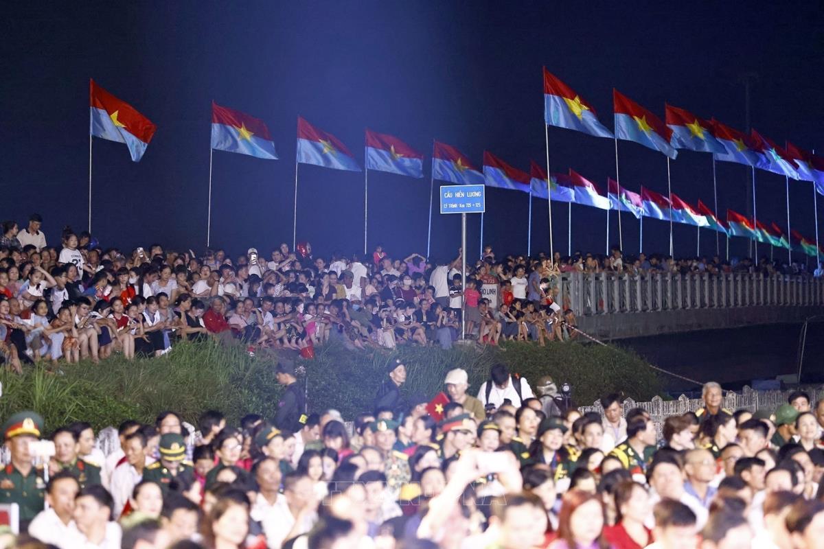 Chương trình Cầu truyền hình trực tiếp "Vang mãi khúc khải hoàn" tại Di tích quốc gia đặc biệt Đôi bờ Hiền Lương - Bến Hải, huyện Vĩnh Linh, tỉnh Quảng Trị (27/4/2025). Ảnh: Doãn Tấn - TTXVN