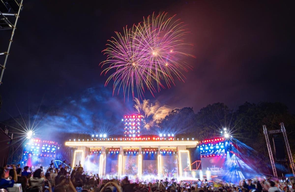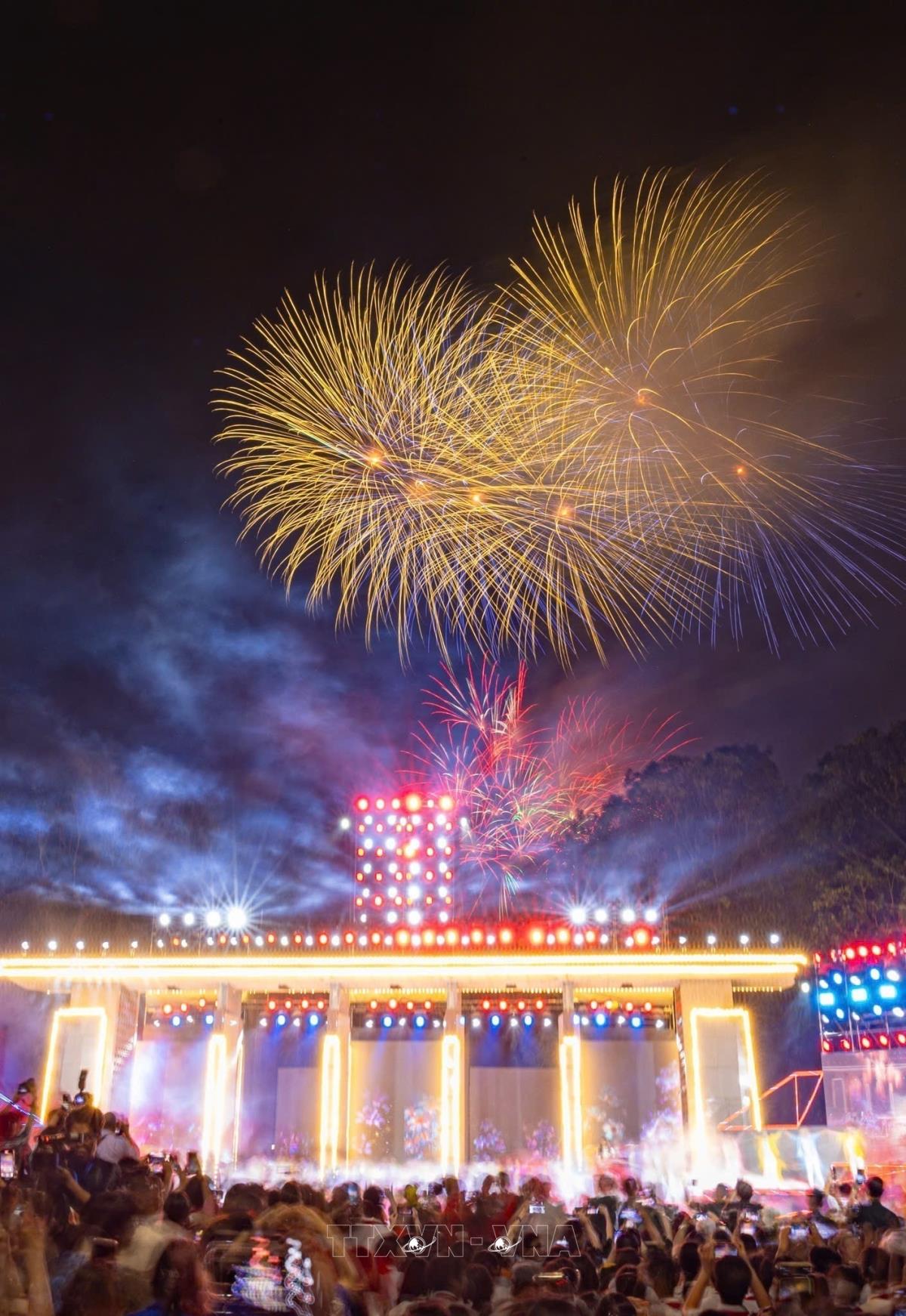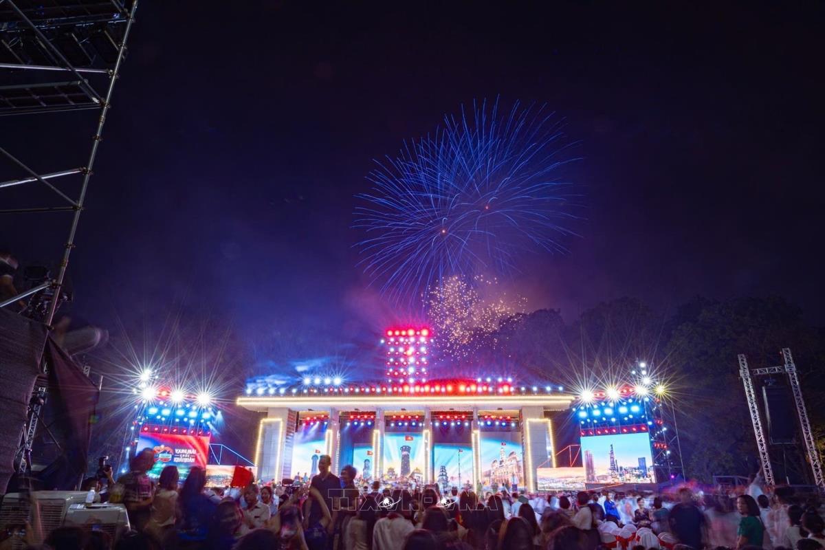 Màn pháo hoa rực rỡ thắp sáng bầu trời tại điểm cầu Công viên Thống Nhất (Hà Nội), chào mừng kỷ niệm 50 năm Ngày Giải phóng miền Nam, thống nhất đất nước (27/4/2025). Ảnh: Phạm Tuấn Anh - TTXVN