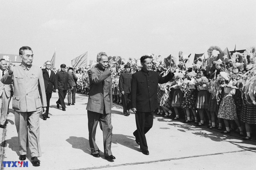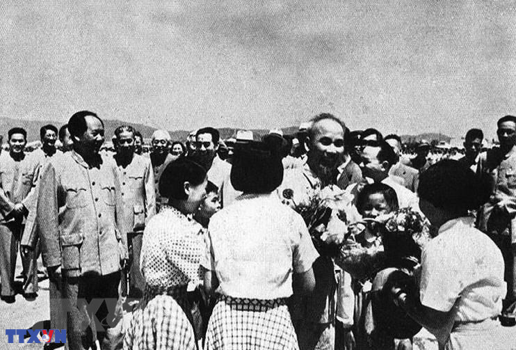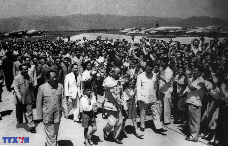 Nhân dân Trung Quốc chào mừng đoàn đại biểu Chính phủ Việt Nam, do Chủ tịch Hồ Chí Minh dẫn đầu, thăm hữu nghị Trung Quốc, tháng 6/1955. (Ảnh: Tư liệu/TTXVN phát)
