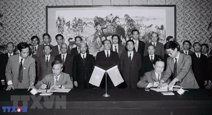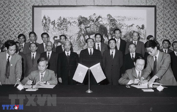Lễ ký kết hiệp định thương mại Trung-Việt và hiệp định tạm thời về việc giải quyết công việc ở biên giới hai nước Trung Quốc – Việt Nam tại thủ đô Bắc Kinh, ngày 7/11/1991, trong chuyến thăm Trung Quốc của Tổng Bí thư Đỗ Mười và Chủ tịch Hội đồng Bộ trưởng Võ Văn Kiệt (5-10/11/1991). (Ảnh: TTXVN)