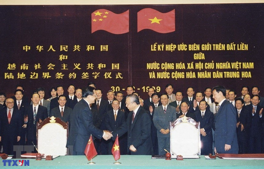Ngày 30/12/1999, tại Hà Nội, Phó Thủ tướng, Bộ trưởng Ngoại giao Nguyễn Mạnh Cầm và Bộ trưởng Ngoại giao Trung Quốc Đường Gia Triền ký Hiệp ước biên giới trên đất liền giữa hai nước. (Ảnh: TTXVN)