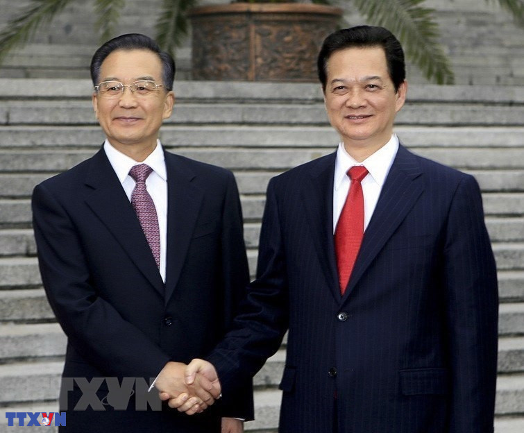 Thủ tướng Ôn Gia Bảo đón Thủ tướng Nguyễn Tấn Dũng thăm hữu nghị chính thức Trung Quốc trong hai ngày 22-23/10/2008. (Ảnh: Đức Tám/TTXVN)