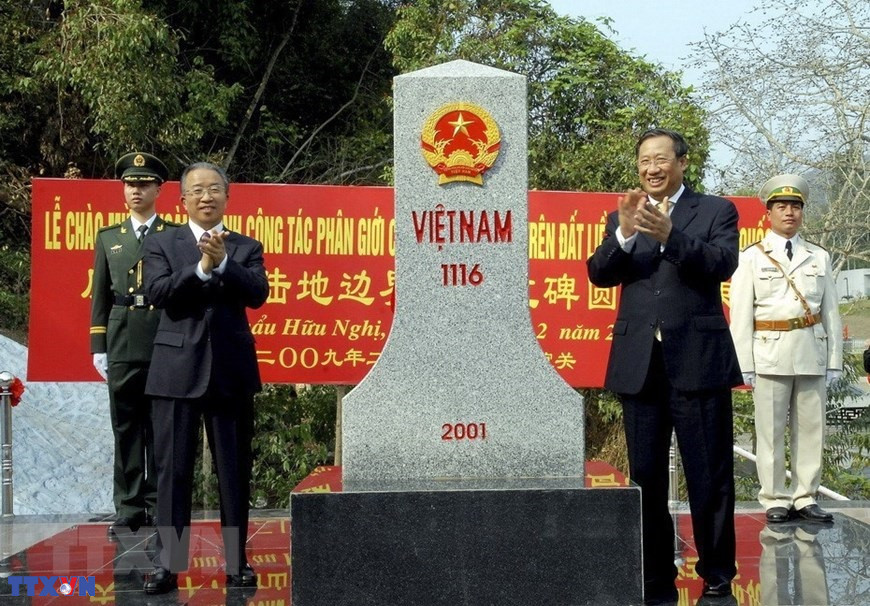 Phó Thủ tướng, Bộ trưởng Ngoại giao Phạm Gia Khiêm và Ủy viên Quốc vụ viện Trung Quốc Đới Bỉnh Quốc tại cột mốc biên giới số 1116 (phía Việt Nam) trong lễ chào mừng hoàn thành công tác phân giới cắm mốc biên giới đất liền Việt Nam-Trung Quốc, ngày 23/2/2009, tại cửa khẩu Hữu Nghị (Lạng Sơn). (Ảnh: Nhan Sáng/TTXVN)