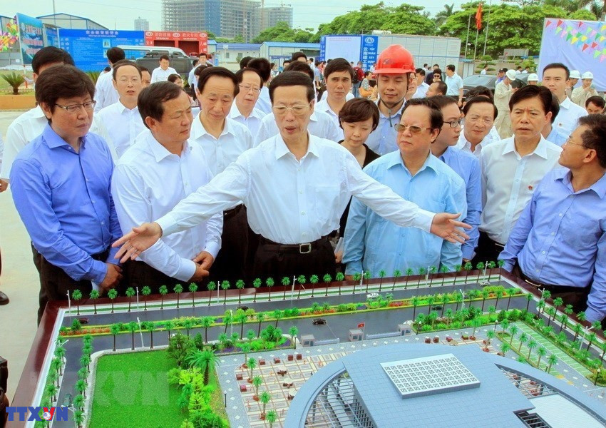Đồng chí Trương Cao Lệ, Ủy viên Thường vụ Bộ Chính trị, Phó Thủ tướng Quốc vụ viện Trung Quốc với các đại biểu thăm Công trình xây dựng Cung Hữu nghị Việt-Trung, ngày 17/7/2015, tại Hà Nội. (Ảnh: An Đăng/TTXVN)