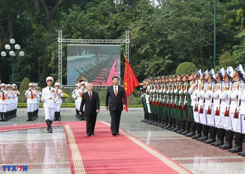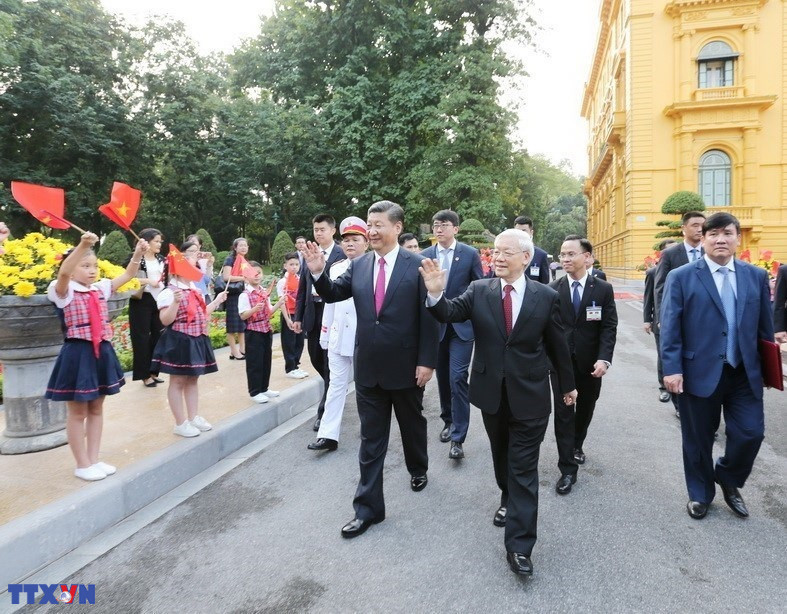 Tổng Bí thư Nguyễn Phú Trọng và Tổng Bí thư, Chủ tịch Trung Quốc Tập Cận Bình vẫy chào nhân dân và Thiếu nhi Thủ đô tại lễ đón, trong chuyến thăm cấp Nhà nước tới Việt Nam từ ngày 12-13/11/2017. (Ảnh: Trí Dũng/TTXVN)