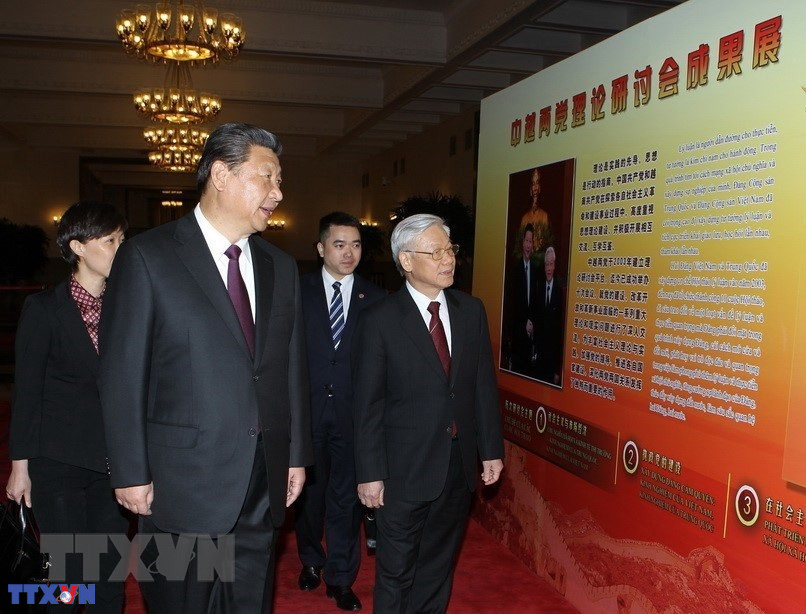 Tổng Bí thư, Chủ tịch Trung Quốc Tập Cận Bình và Tổng Bí thư Nguyễn Phú Trọng tham quan Triển lãm Thành quả Hội thảo lý luận giữa Đảng Cộng sản Trung Quốc và Đảng Cộng sản Việt Nam, nhân chuyến thăm chính thức Trung Quốc từ ngày 7-10/4/2015. (Ảnh: Trí Dũng/TTXVN)