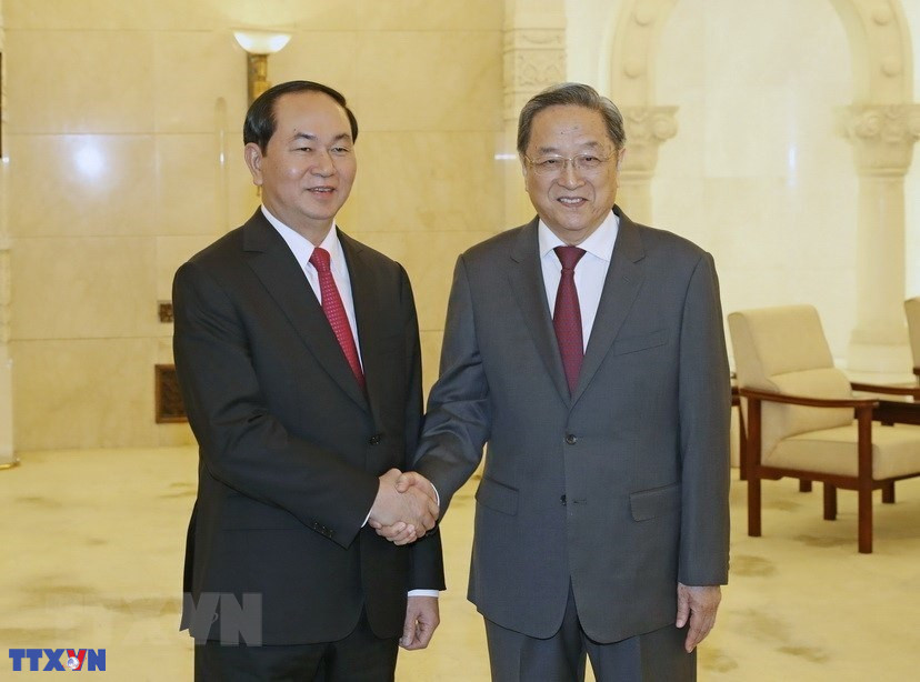 Chiều 12/5/2017, tại Bắc Kinh, Chủ tịch nước Trần Đại Quang gặp Ủy viên Thường vụ Bộ Chính trị, Chủ tịch Ủy ban toàn quốc Hội nghị Hiệp thương Chính trị nhân dân Toàn quốc Trung Quốc Du Chính Thanh, trong chuyến thăm cấp Nhà nước tới Trung Quốc. (Ảnh: Nhan Sáng/TTXVN)