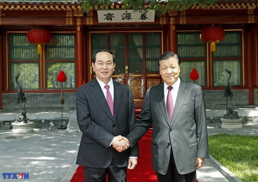 Sáng 12/5/2017, tại Bắc Kinh, Chủ tịch nước Trần Đại Quang gặp Ủy viên Thường vụ Bộ Chính trị, Bí thư Ban Bí thư Trung ương Đảng Cộng sản Trung Quốc Lưu Vân Sơn, trong chuyến thăm cấp Nhà nước tới Trung Quốc. (Ảnh: Nhan Sáng/TTXVN)