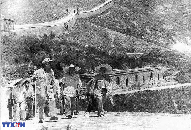 Chủ tịch Hồ Chí Minh tham quan Vạn lý trường thành, trong chuyến thăm hữu nghị Trung Quốc, tháng 7/1955. (Ảnh: Tư liệu/TTXVN phát)