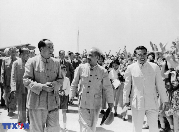 Chủ tịch Trung Quốc Mao Trạch Đông đón Chủ tịch Hồ Chí Minh thăm hữu nghị Trung Quốc, tại sân bay Bắc Kinh, ngày 25/6/1955. (Ảnh: Tư liệu/TTXVN phát)