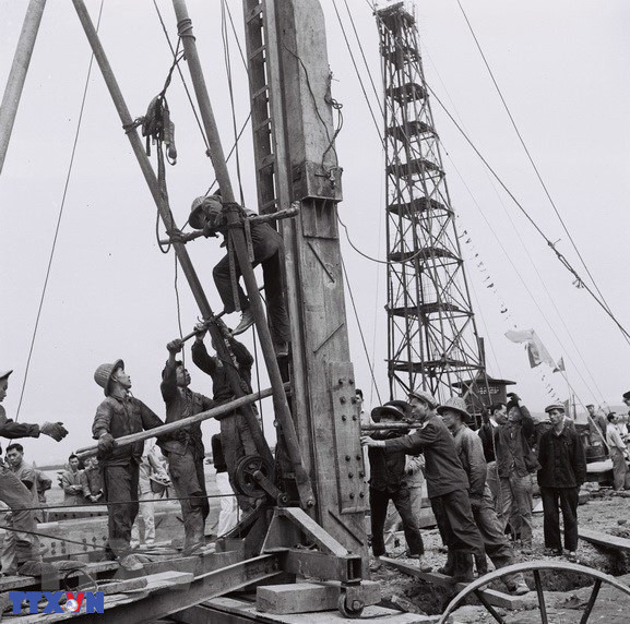 Công nhân kỹ thuật Trung Quốc và Việt Nam điều khiển máy đóng cọc để làm đê quai xanh chắn nước trong thi công xây dựng triền tàu Nhà máy đóng tàu Hải Phòng (1960). (Ảnh: Lâm Hồng/TTXVN)
