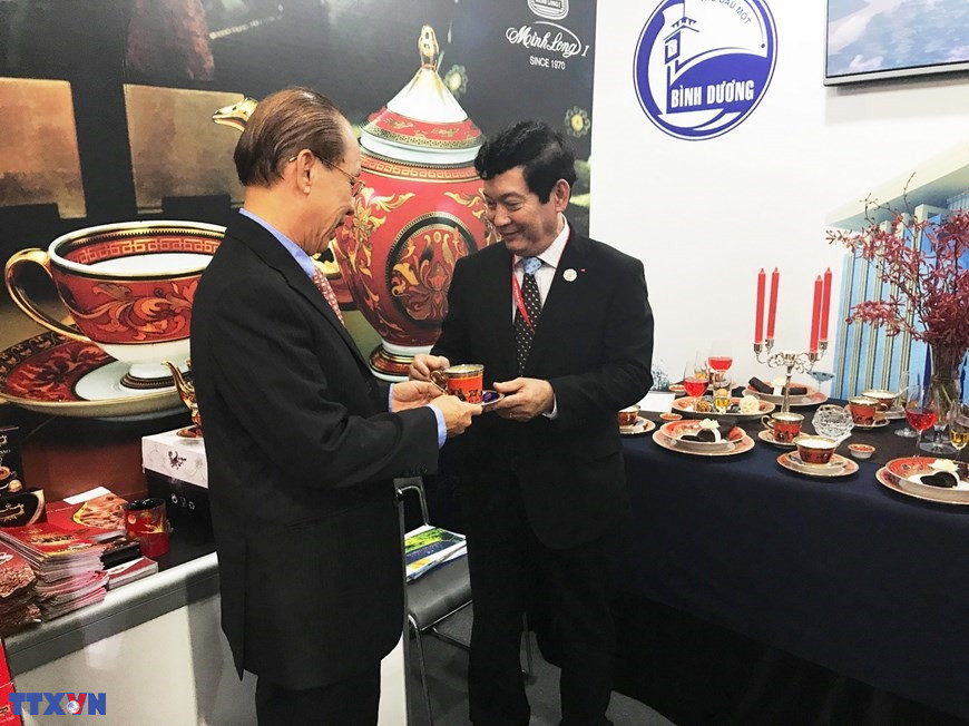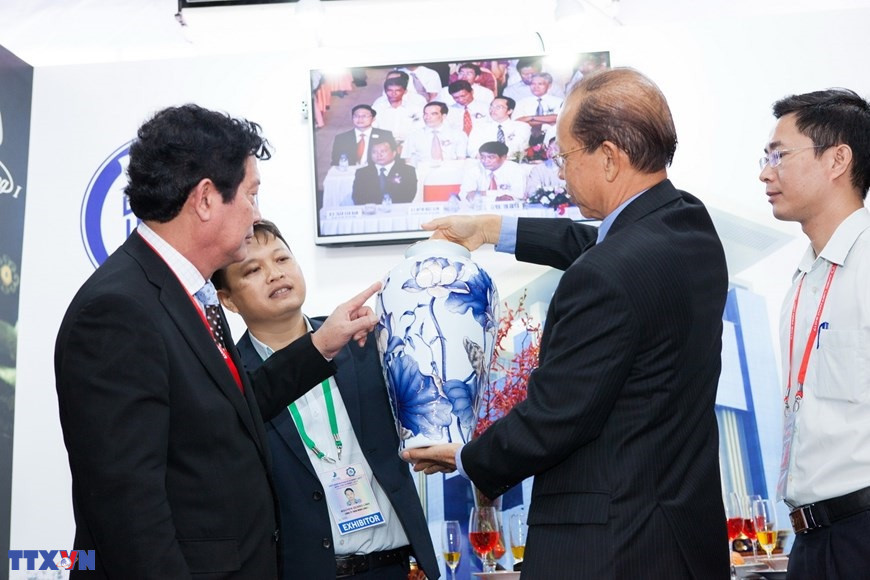 Thứ trưởng Bộ Văn hóa thể thao du lịch Huỳnh Vĩnh Ái (phải) thăm gian hàng.