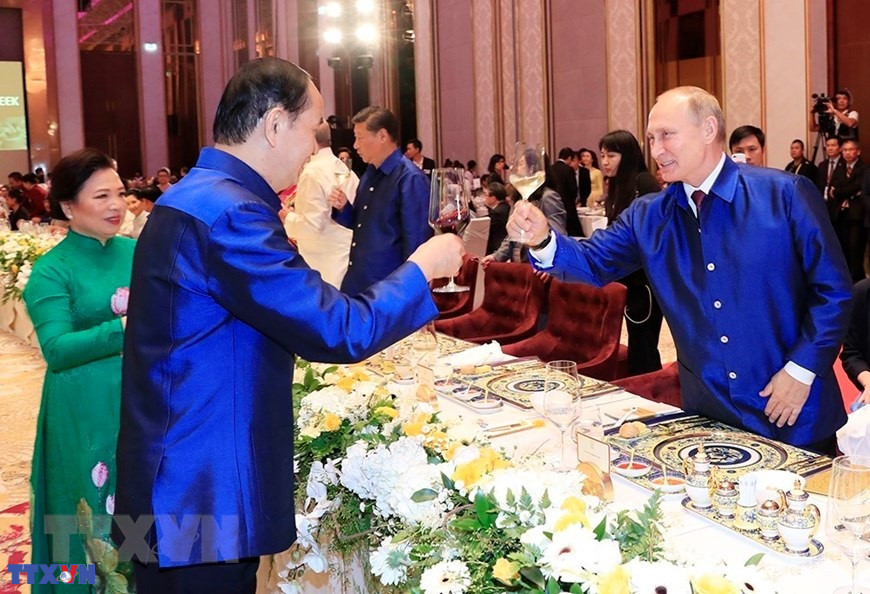 Chủ tịch nước Trần Đại Quang và Phu nhân nâng cốc chúc mừng Tổng thống Nga Vladimir Putin. (Ảnh: TTXVN)