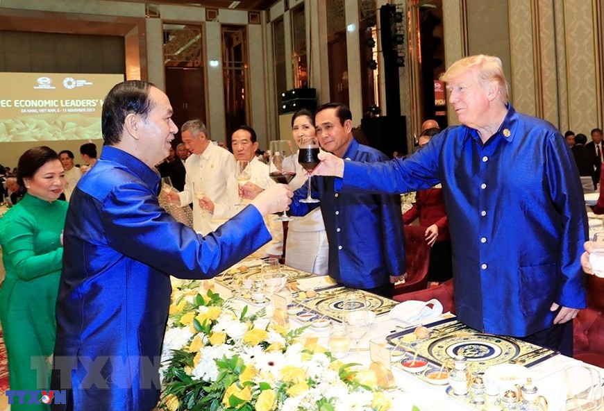 Chủ tịch nước Trần Đại Quang nâng cốc chúc mừng Tổng thống Hoa Kỳ Donald Trump. (Ảnh: TTXVN)