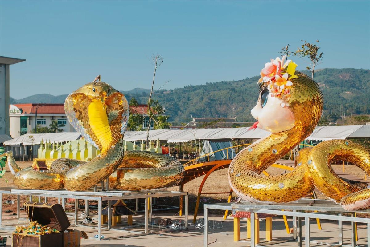 Cặp linh vật rắn do nghệ nhân Đinh Văn Tâm (33 tuổi), trú tại xã Triệu Độ, huyện Triệu Phong, tỉnh Quảng Trị cùng đội ngũ sáng tạo đã được đặt tại trung tâm thị trấn Lao Bảo, huyện Hướng Hoá (Quảng Trị). Linh vật rắn được mọi người khen ngợi vì vẻ đẹp độc đáo của mình. Ảnh: Thanh Thuỷ-TTXVN
