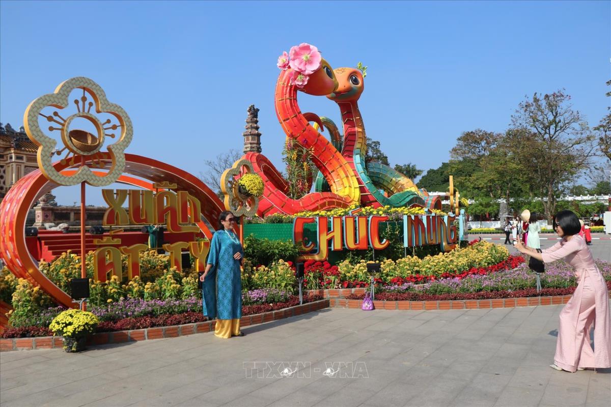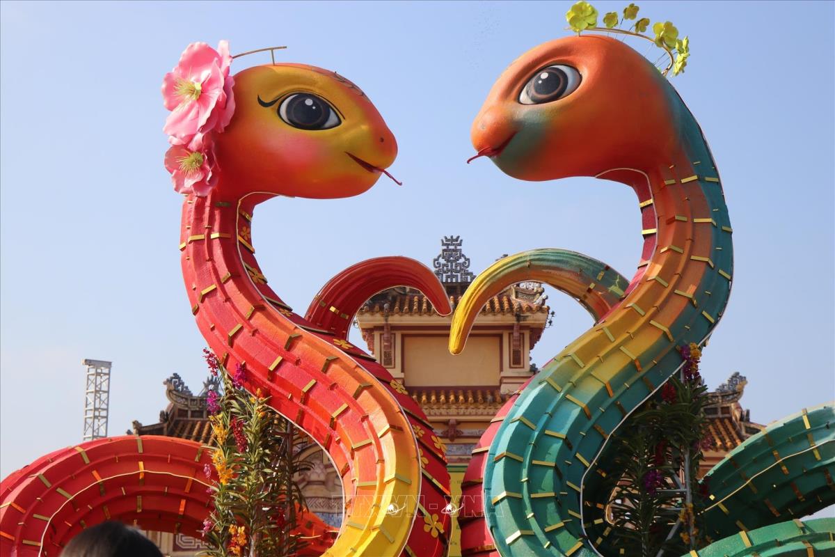 Tạo hình của linh vật rắn Huế thân thiện và rực rỡ sắc xuân. Ảnh: Mai Trang - TTXVN