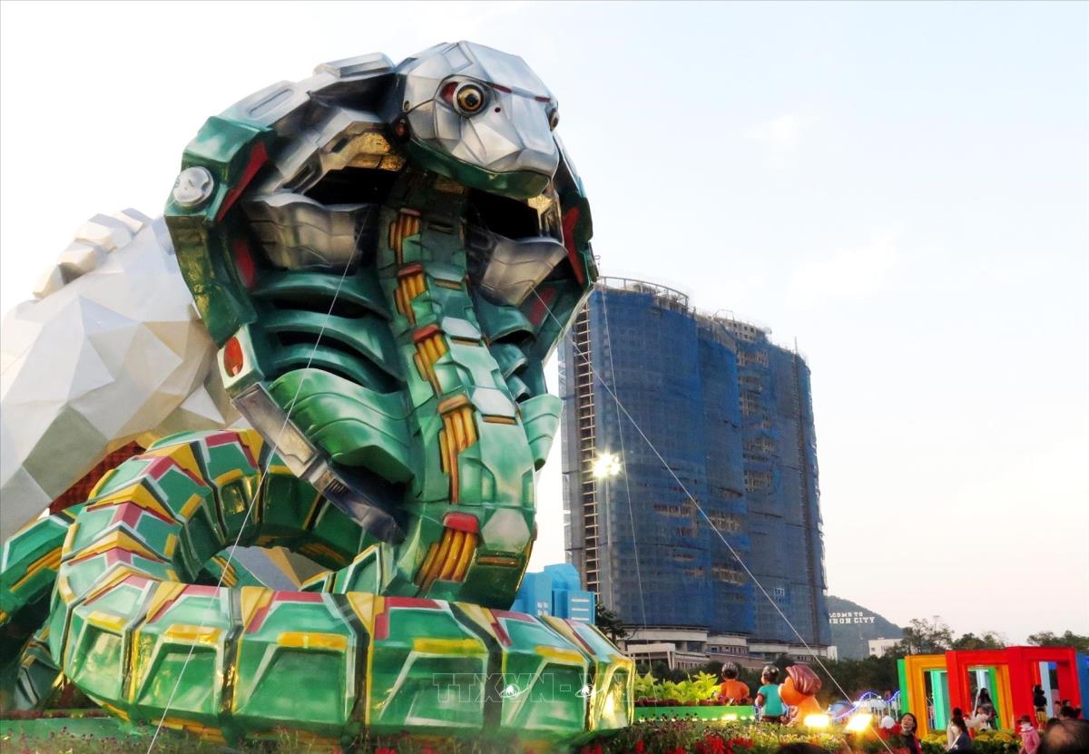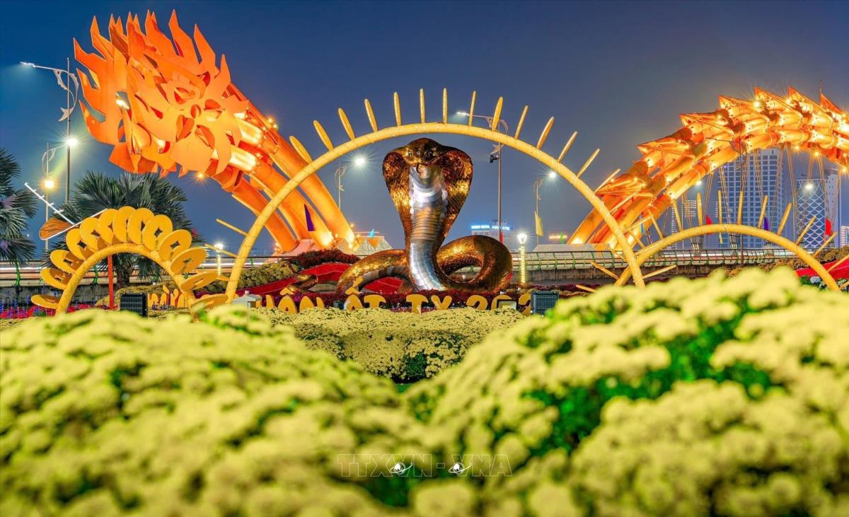 Linh vật năm Ất Tỵ được bố trí bên cạnh cầu Rồng (Đà Nẵng) được chế tác công phu, tỷ mỹ tạo nên lên vẻ đẹp hào nhoáng và uy nghiêm. Ảnh: Văn Dũng-TTXVN