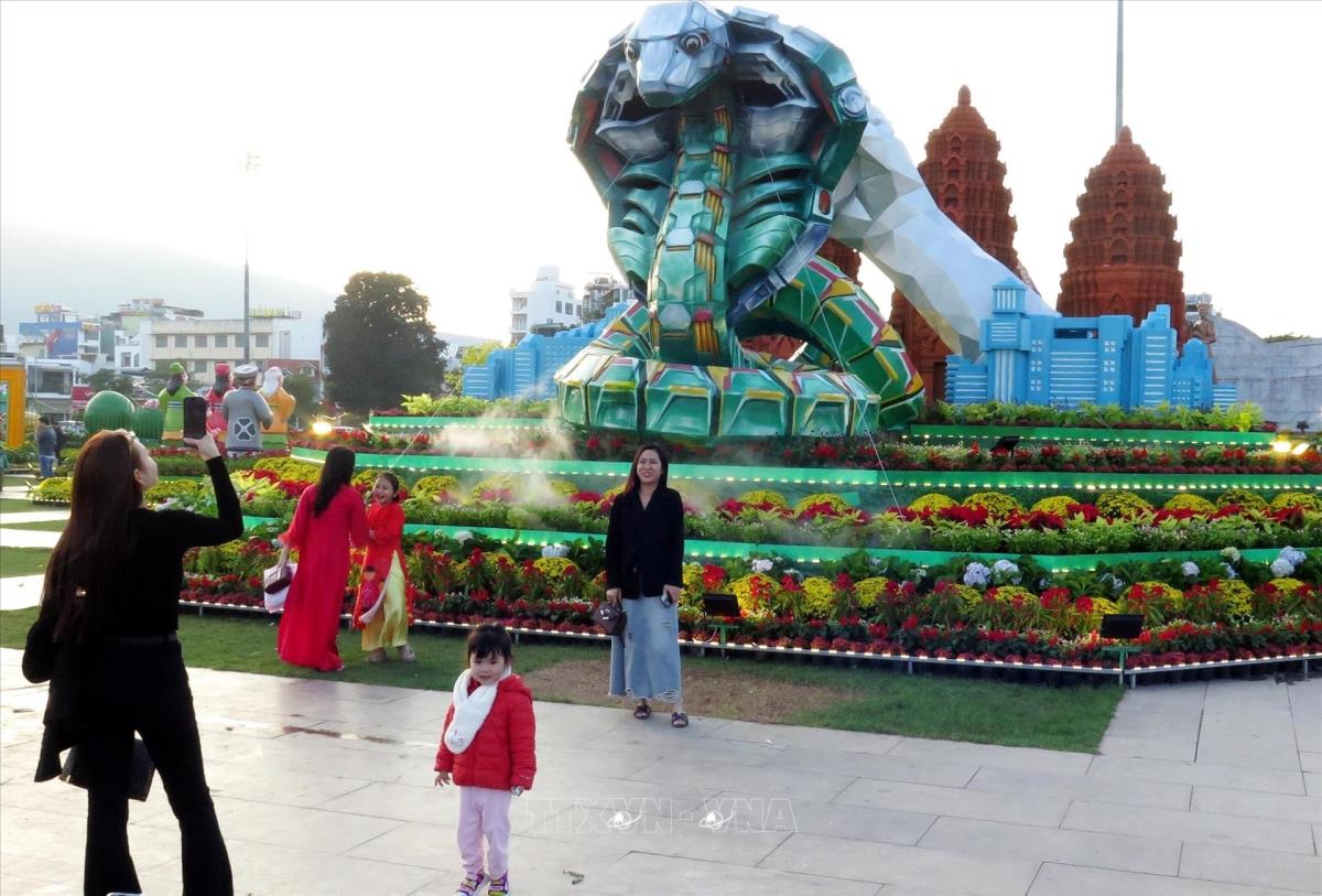 Người dân và du khách tham quan, chụp ảnh lưu niệm tại Cụm Linh vật Ất Ty 2025 ở quảng trường Nguyễn Tất Thành (Bình Định). Ảnh: Lê Phước Ngọc-TTXVN