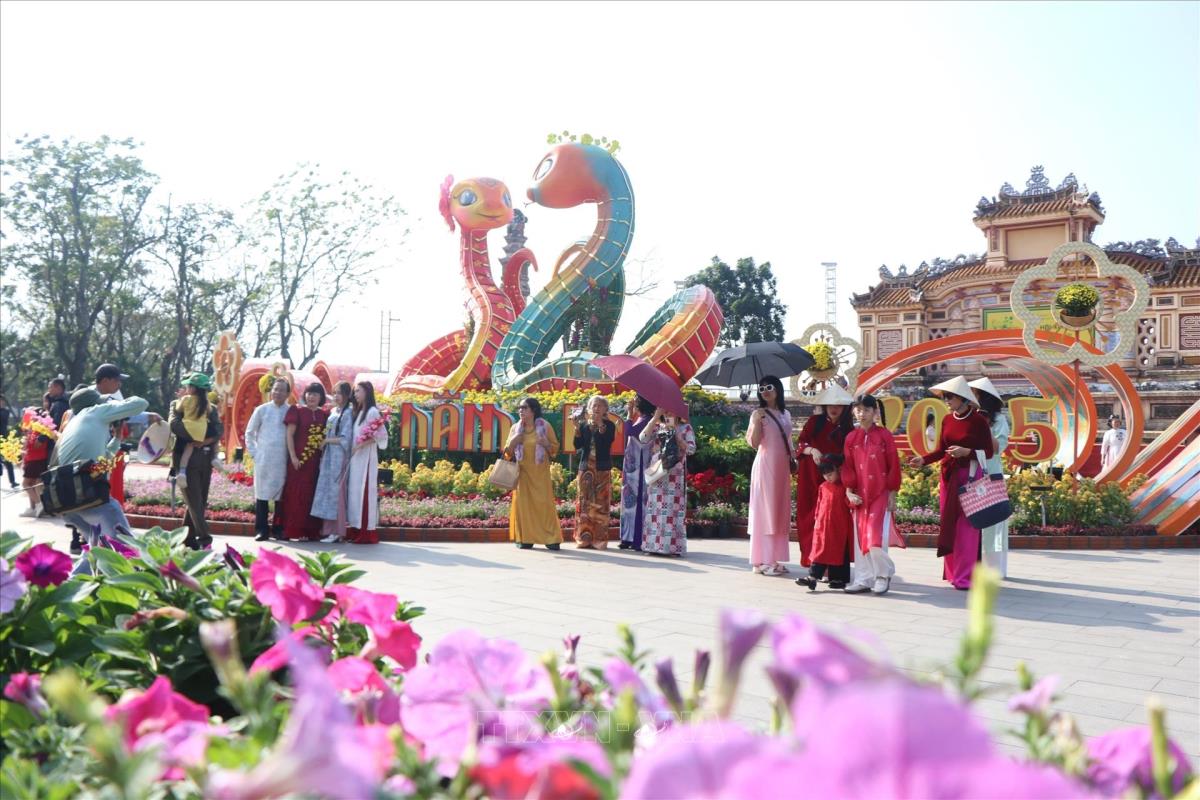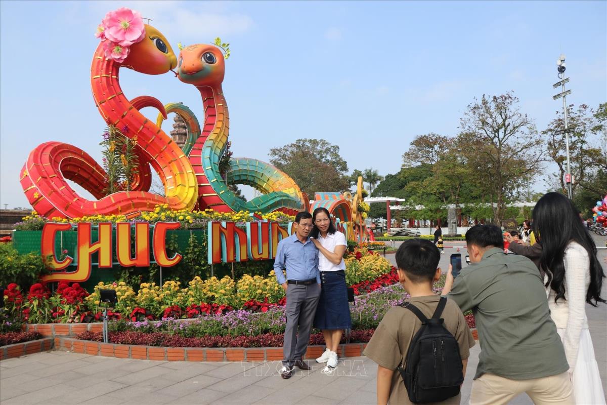Người dân chụp ảnh cùng linh vật rắn Tết Ất Tỵ 2025 tại khu vực Đài tưởng niệm chiến sĩ trận vong (hay còn gọi là Bia Quốc Học). Ảnh: Mai Trang - TTXVN