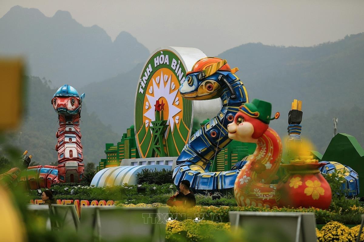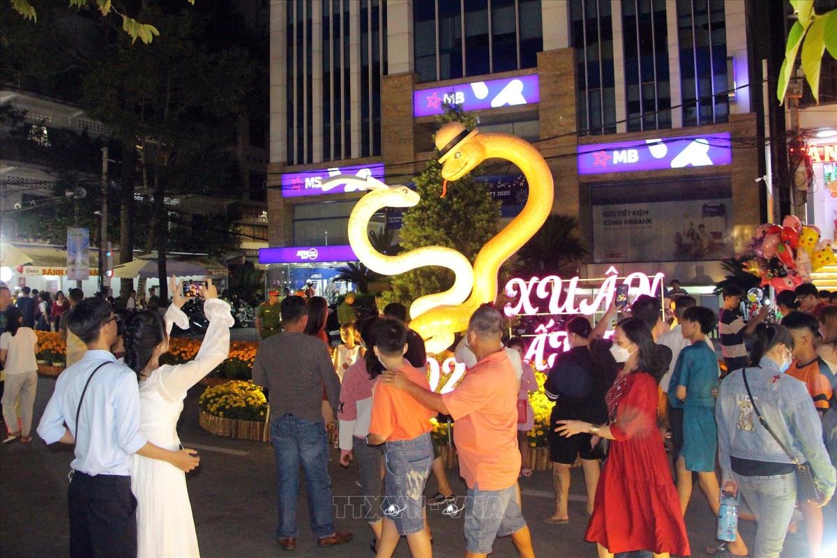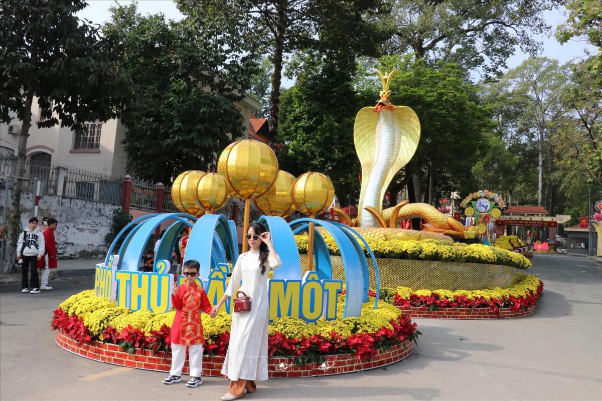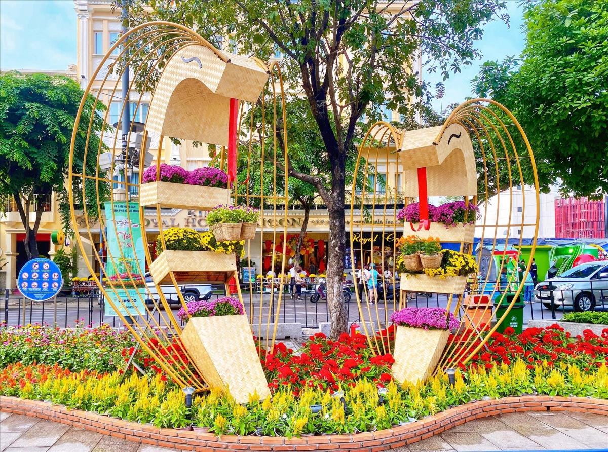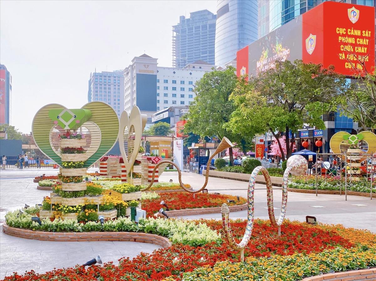 Đường hoa Nguyễn Huệ năm nay có khoảng 90 tạo hình linh vật rắn, sử dụng 109.000 giỏ hoa trang trí. Ảnh: Hồng Giang-TTXVN