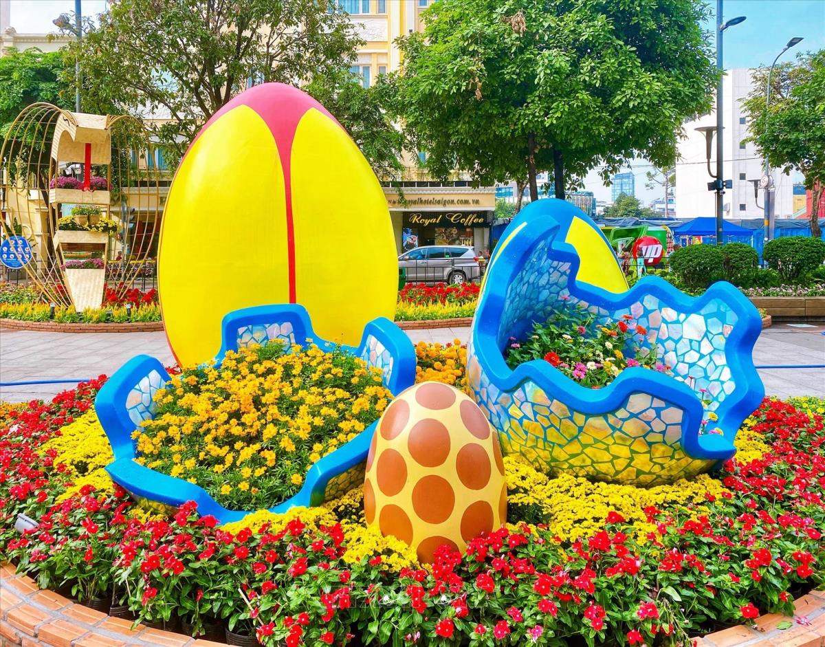 Mô hình trứng rắn thể hiện cho những điều mới mẻ trong năm mới, tại đường hoa Nguyễn Huệ (TP Hồ Chí Minh). Ảnh: Hồng Giang-TTXVN