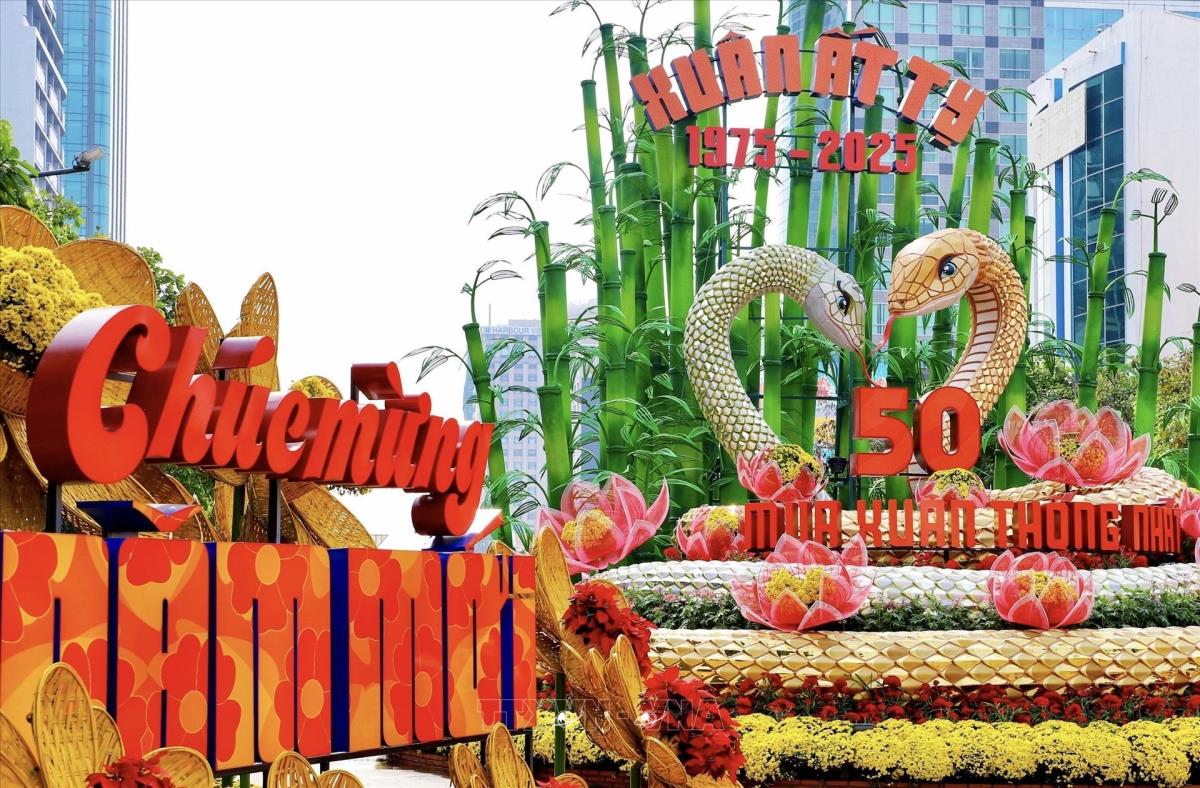 Một tiểu cảnh hoa trang trí linh vật rắn tết Ất Tỵ 2025, tại đường hoa Nguyễn Huệ (TP Hồ Chí Minh). Ảnh: Hồng Giang-TTXVN