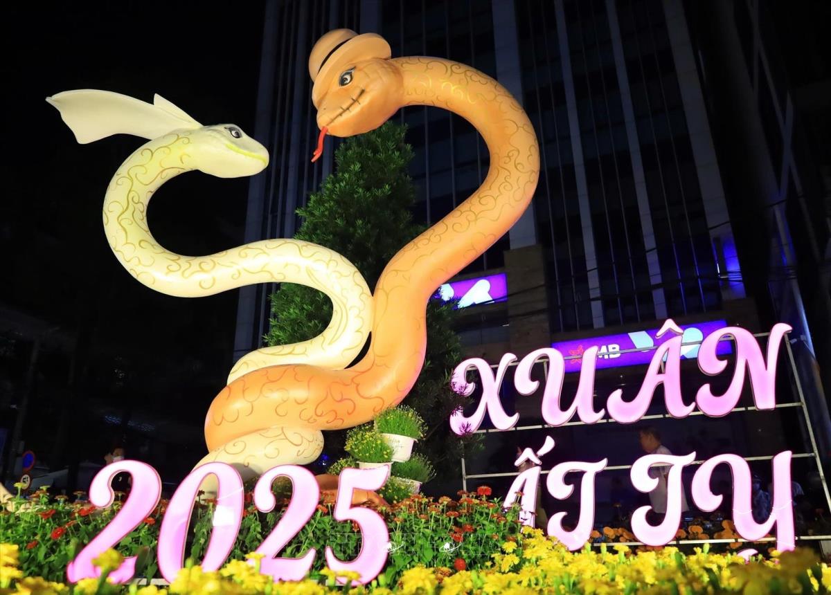 Cặp đôi Ngân Tỵ và Kim Tỵ dài 25-42 m, toàn thân uốn lượn 3 vòng đan xen nhau được chế tác từ vật liệu thân thiện môi trường, tại đường hoa Nguyễn Huệ (TP Hồ Chí Minh). Ảnh: Hồng Giang-TTXVN