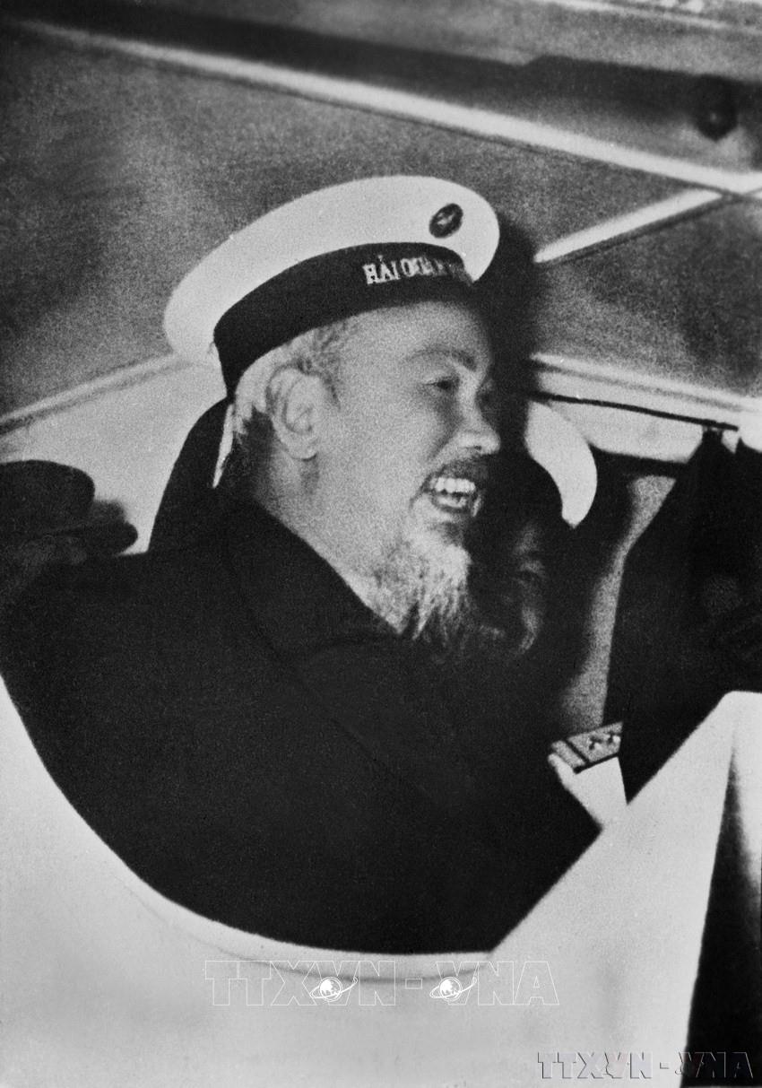 Chủ tịch Hồ Chí Minh đội chiếc mũ Hải quân nhân dân Việt Nam khi đến thăm một đơn vị Hải quân đang sẵn sàng chiến đấu bảo vệ vùng biển Tổ quốc, ngày 22/1/1962. Ảnh: TTXVN