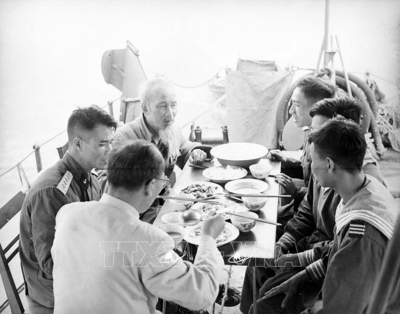 Chủ tịch Hồ Chí Minh đến thăm và cùng ăn cơm trên tàu với cán bộ, chiến sĩ bộ đội hải quân bảo vệ bờ biển Quảng Ninh (1965). Ảnh: TTXVN