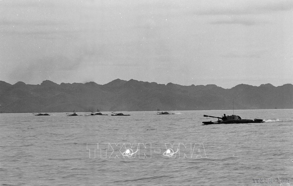 Trong cuộc chiến tranh bảo vệ biên giới Tây Nam, lực lượng vận tải quân sự của hải quân đã tổ chức vận chuyển hàng hóa quân sự và hàng chục nghìn lượt lượt cán bộ, chiến sĩ ra chiến trường và đổ bộ chiến đấu, làm nhiệm vụ quốc tế giúp Campuchia đánh đổ chế độ diệt chủng Pol Pot, hồi sinh đất nước. Trong ảnh: Hải quân đánh bộ hiệp đồng đổ bộ trong chiến dịch Tà Lơn, giải phóng cảng Kampong Som và cảng Ream, mở đầu cho công cuộc giúp nhân dân Campuchia tiêu diệt chế độ diệt chủng Pol Pot, tháng 1/1979. Ảnh: TTXVN phát