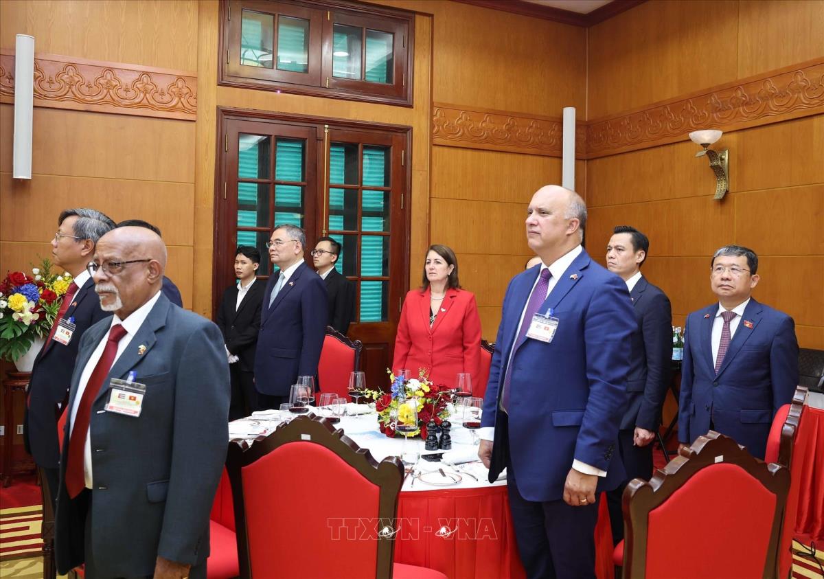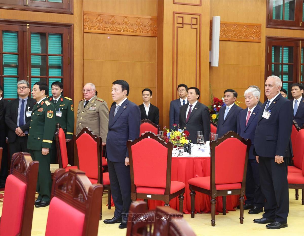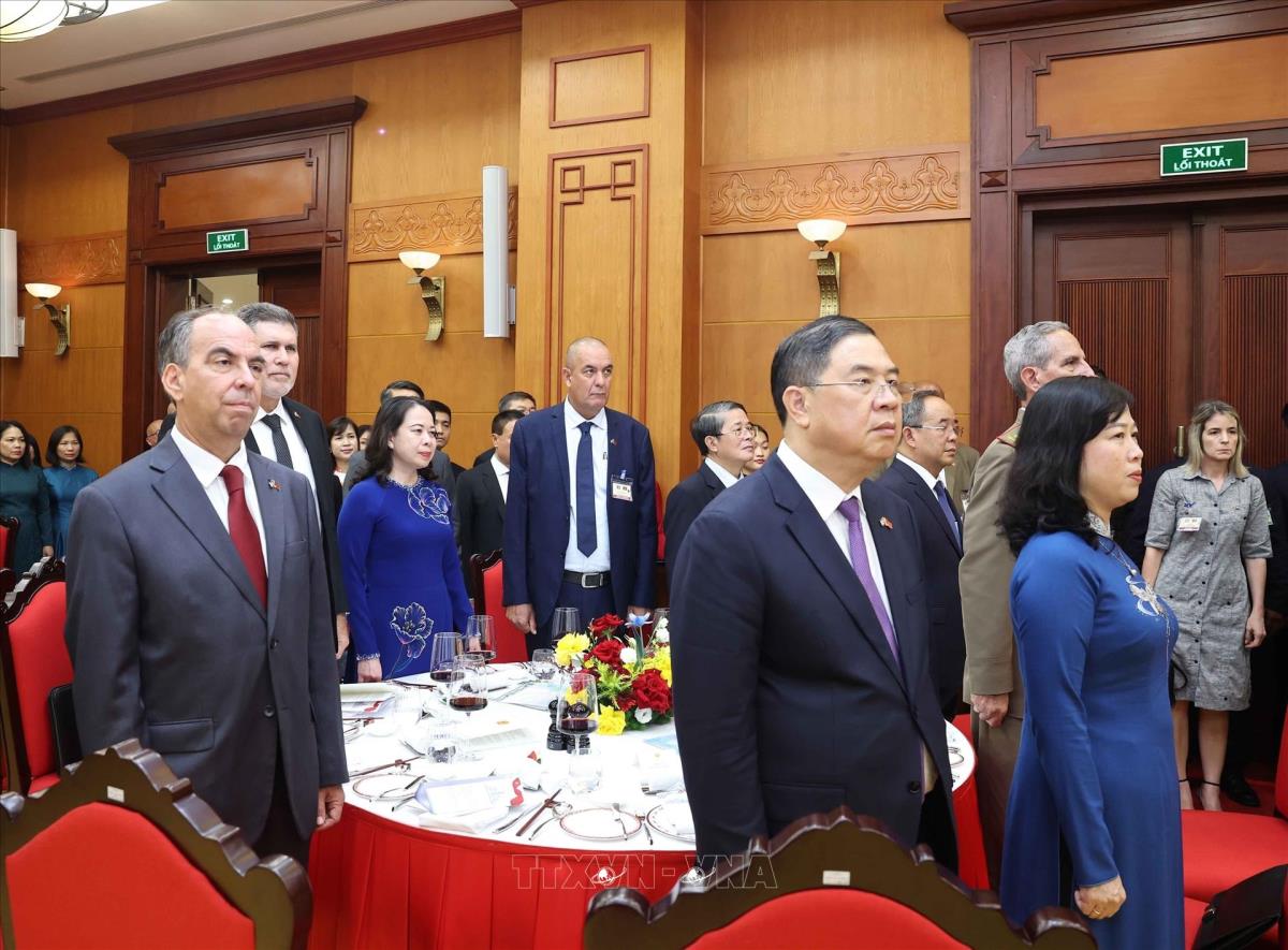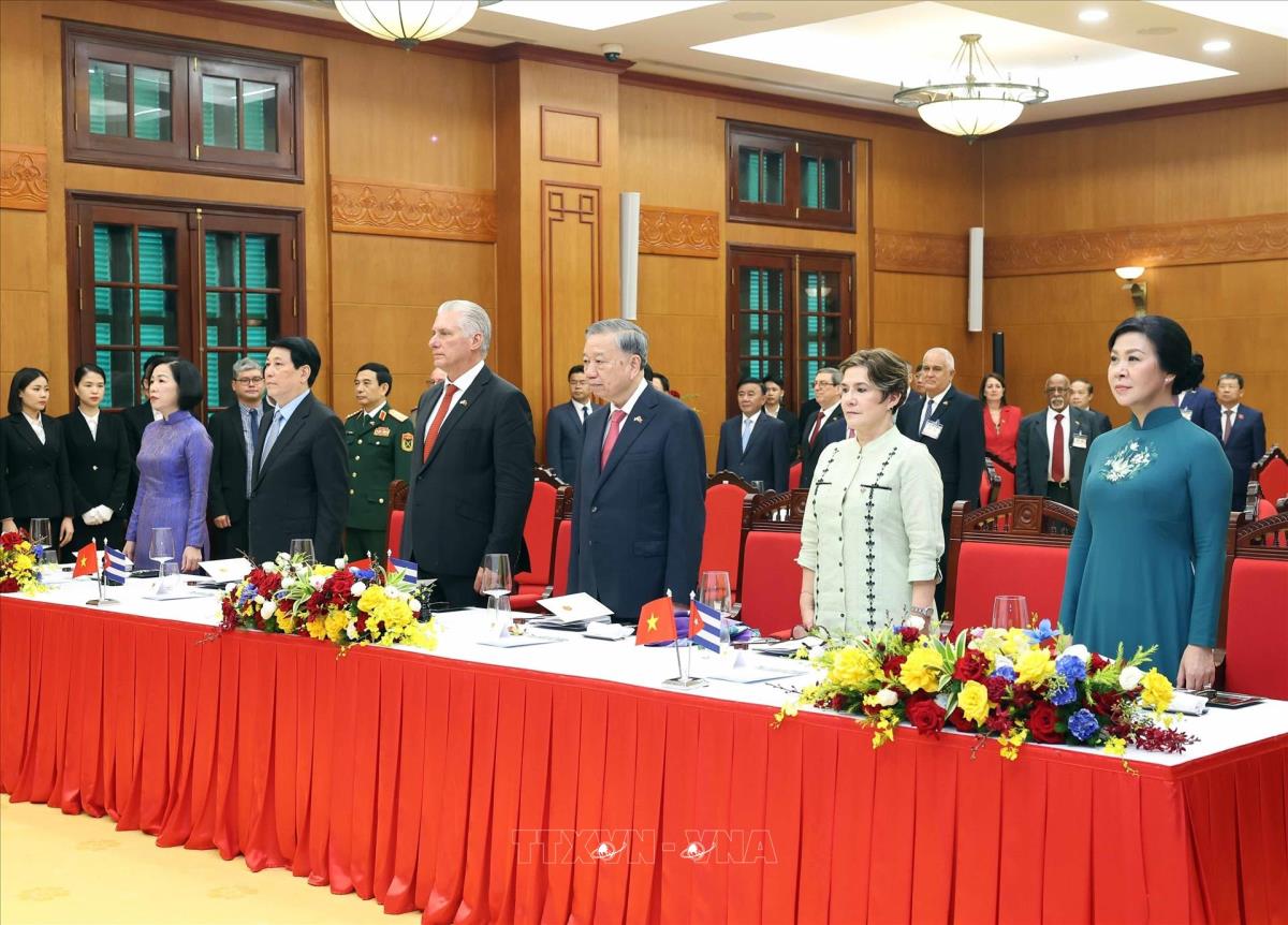 Hà Nội (TTXVN 1/9/2025) Trưa 1/9/2025, tại Hà Nội, Tổng Bí thư Tô Lâm và Phu nhân cùng Chủ tịch nước Lương Cường và Phu nhân đồng chủ trì Chiêu đãi trọng thể cấp Nhà nước chào mừng Bí thư thứ Nhất Ban Chấp hành Trung ương Đảng Cộng sản Cuba, Chủ tịch nước Cộng hòa Cuba Miguel Díaz-Canel Bermúdez và Phu nhân cùng Đoàn đại biểu cấp cao Cuba thăm cấp Nhà nước tới Việt Nam.