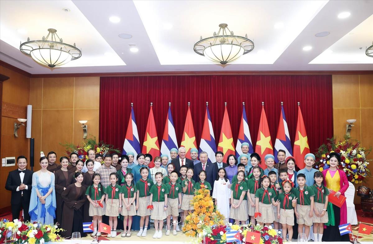 Tổng Bí thư Tô Lâm và Phu nhân, Chủ tịch nước Lương Cường và Phu nhân cùng Bí thư thứ Nhất Đảng Cộng sản Cuba, Chủ tịch nước Cuba Miguel Díaz-Canel Bermúdez và Phu nhân với các nghệ sĩ biểu diễn chào mừng tại cuộc Chiêu đãi (1/9/2025). Ảnh: Thống Nhất - TTXVN
