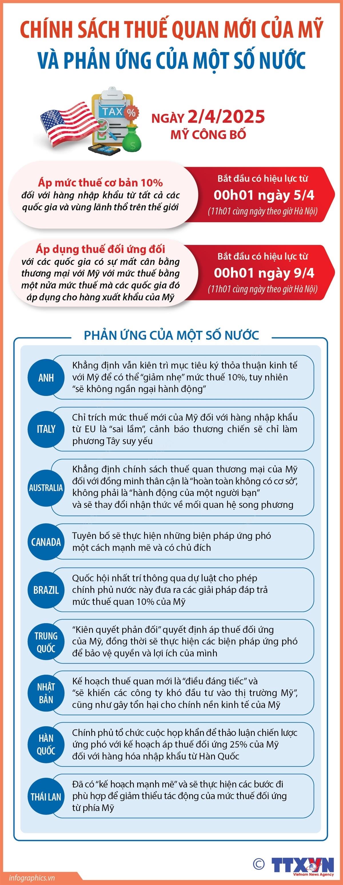 Tổng thống Mỹ Donald Trump chiều 2/4/2025 (giờ địa phương) đã công bố áp mức thuế cơ bản 10% đối với hàng nhập khẩu từ tất cả các quốc gia và vùng lãnh thổ trên thế giới. Ngoài mức thuế cơ bản 10%, chính quyền Trump cũng sẽ áp dụng thuế đối ứng đối với các quốc gia khác mà Nhà Trắng coi là có sự mất cân bằng thương mại với Mỹ. Mức thuế này sẽ bằng một nửa mức thuế mà các quốc gia đó áp dụng cho hàng xuất khẩu của Mỹ. Nhà Trắng cùng ngày xác nhận “mức thuế 10% sẽ bắt đầu có hiệu lực từ 00h01 ngày 5/4 (11h01 cùng ngày theo giờ Hà Nội), trong khi những mức thuế cao hơn đối với các đối tác khác nhau sẽ bắt đầu từ có hiệu lực từ 00h01 ngày 9/4 (11h01 cùng ngày theo giờ Hà Nội)”. Nhiều nước đã có phản ứng mạnh mẽ trước động thái này của Mỹ.