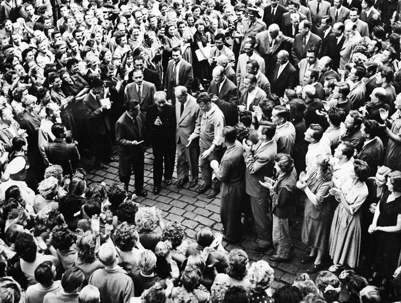 Lãnh đạo Đảng, Nhà nước Ba Lan cùng đông đảo người dân thủ đô Varsava nồng nhiệt chào đón Chủ tịch Hồ Chí Minh thăm chính thức Ba Lan, ngày 21/7/1957. Ảnh: TTXVN