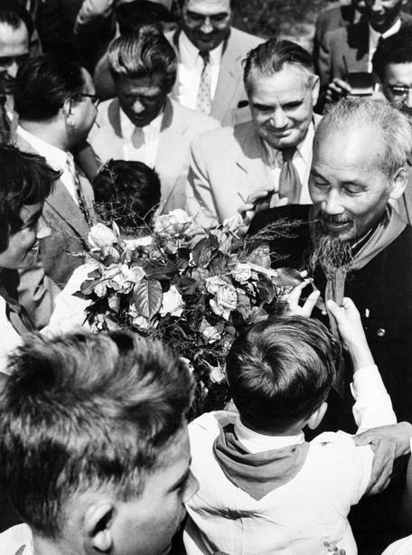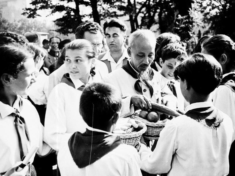 Chủ tịch Hồ Chí Minh đến thăm thiếu niên Bulgaria tại Cung Thiếu niên ở thủ đô Sofia (16/8/1957). Ảnh: TTXVN