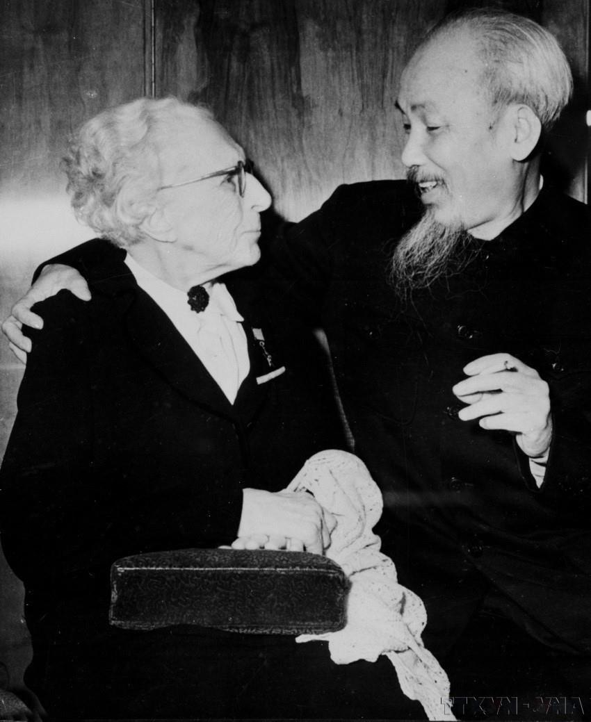 Chủ tịch Hồ Chí Minh với nữ đảng viên từ năm 1898, đại biểu cao tuổi nhất tại Đại hội 22 Đảng cộng sản Liên Xô (10/1961). Ảnh: TTXVN