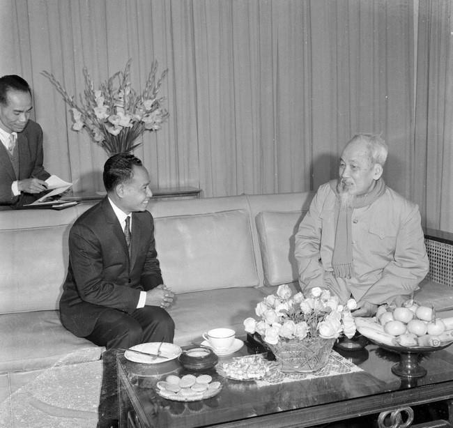Chủ tịch Hồ Chí Minh tiếp Hoàng thân Norodom Phurissara, Bộ trưởng Ngoại giao Vương quốc Campuchia sang thăm Việt Nam (10/1/1968). Ảnh: Tư liệu TTXVN