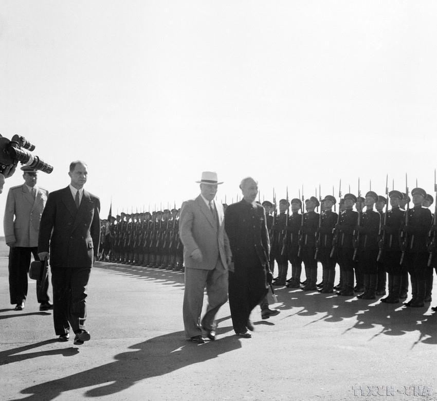 Chủ tịch Hồ Chí Minh duyệt đội danh dự Quân đội Liên Xô trong lễ đón đoàn đại biểu Chính phủ Việt Nam thăm chính thức Liên Xô ngày 12/7/1955. Ảnh: Tư liệu TTXVN