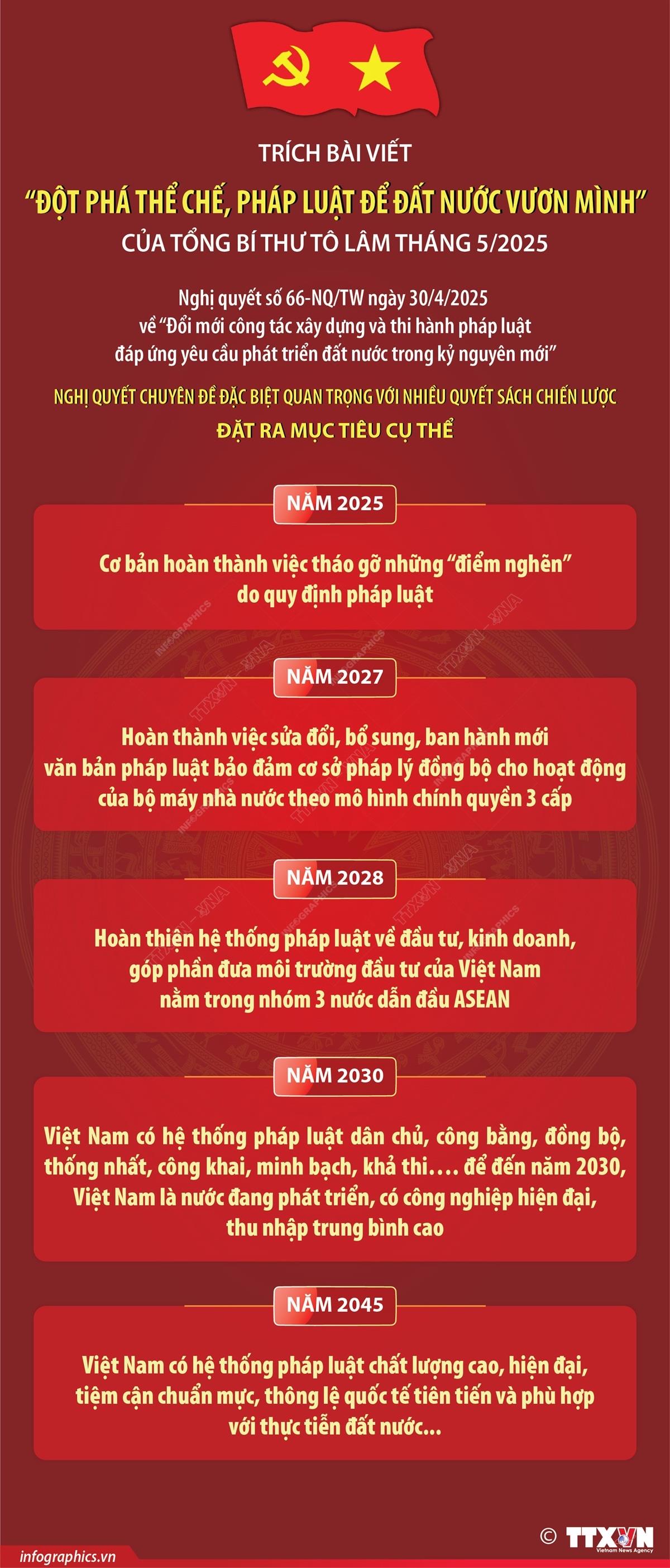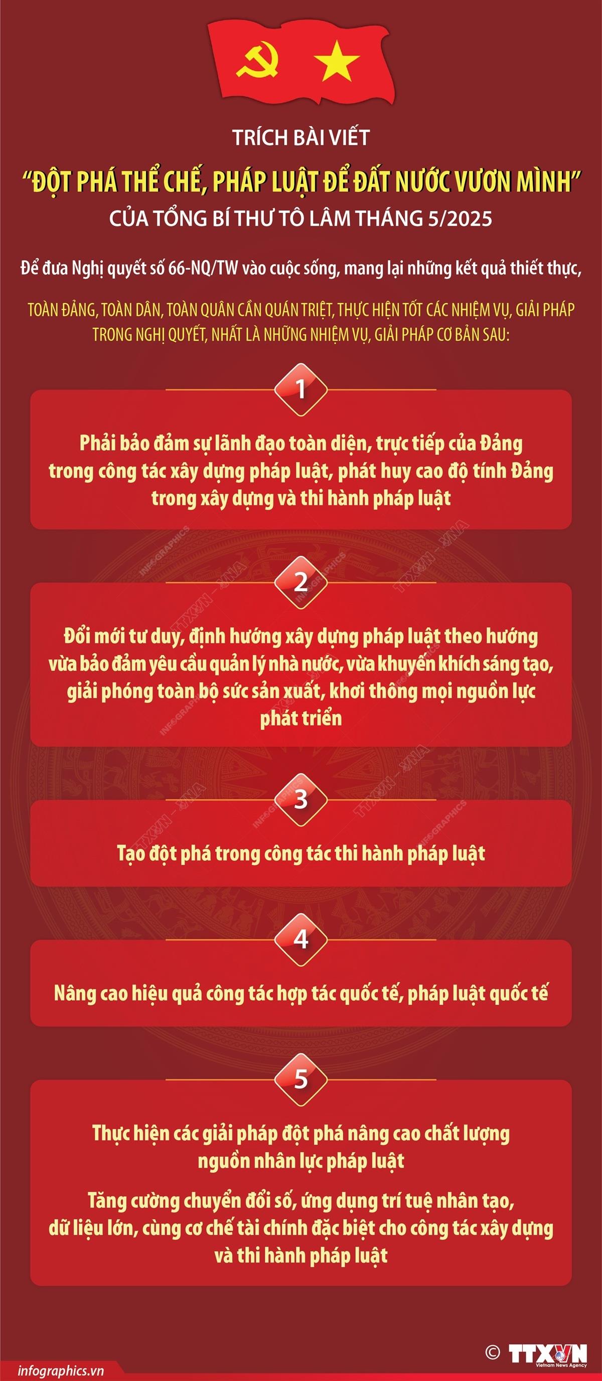Trong bài viết "ĐỘT PHÁ THỂ CHẾ, PHÁP LUẬT ĐỂ ĐẤT NƯỚC VƯƠN MÌNH", Tổng Bí thư Tô Lâm cũng đã khẳng định, để hiện thực hóa khát vọng vươn mình của dân tộc, “một nhiệm vụ rất trọng tâm là phải tiếp tục quan tâm hoàn thiện thể chế, pháp luật để giải phóng toàn bộ sức sản xuất, khơi thông mọi nguồn lực, phát huy mọi tiềm năng, thế mạnh của đất nước, tận dụng mọi cơ hội phát triển”.