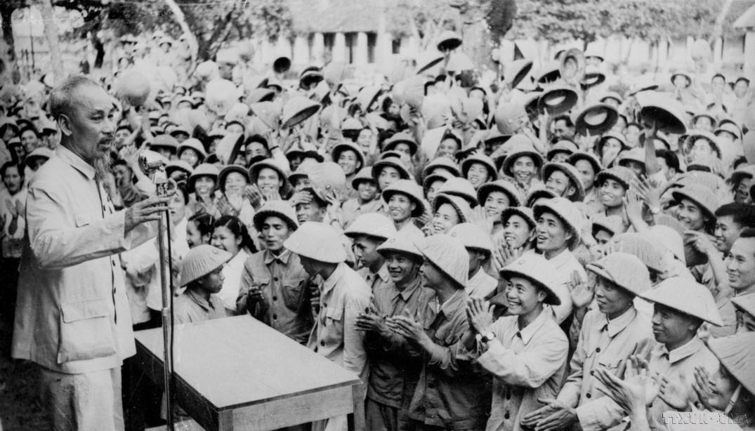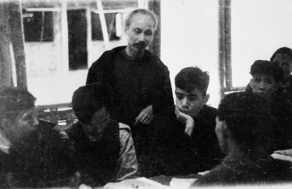 Chủ tịch Hồ Chí Minh chỉ đạo công tác Bình dân học vụ (Hà Nội, 1954). Ảnh: TTXVN
